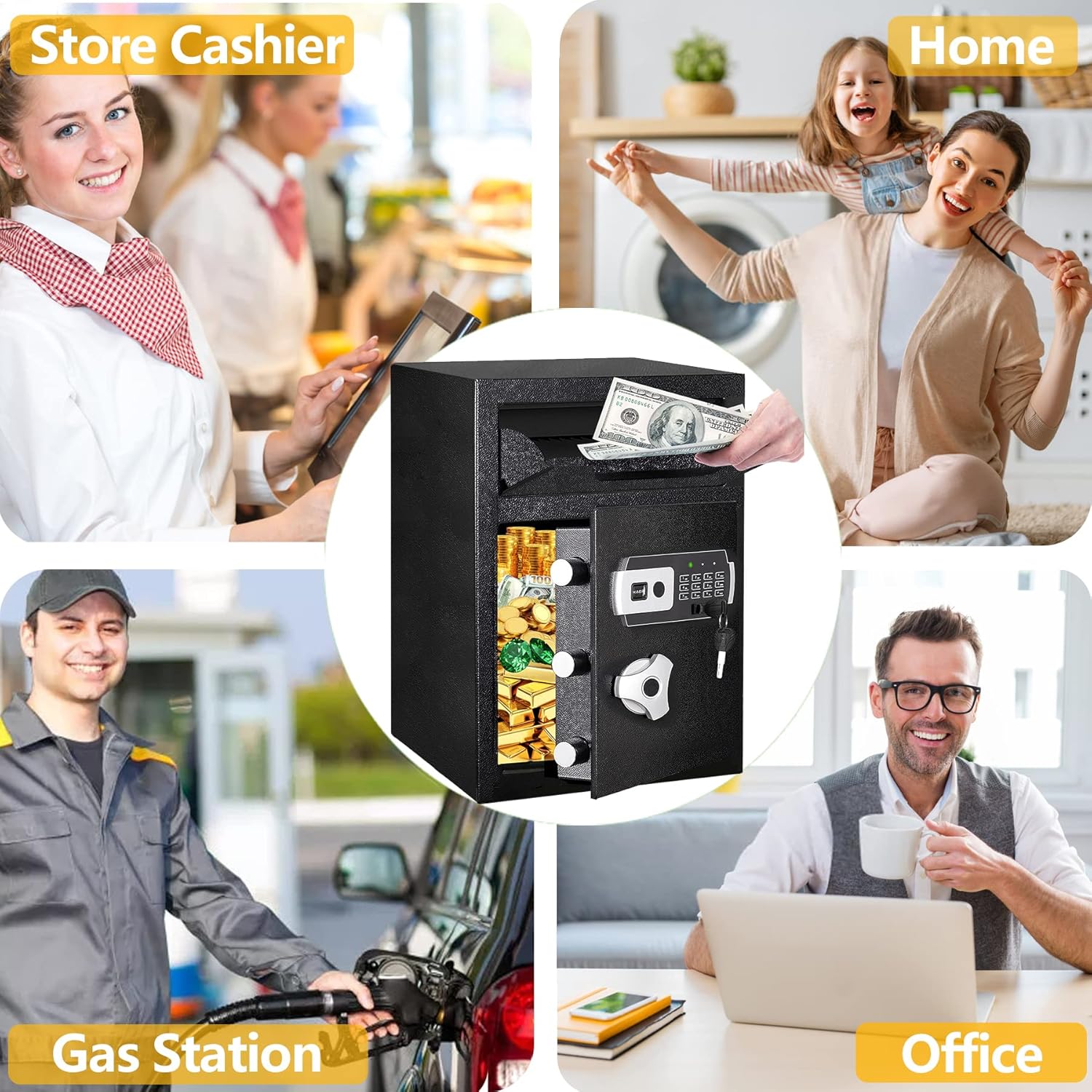 💰【LED LIGHT+SILENT FUNCTION+120° OPEN DOOR】You will get a drop slot safe: ① The LED light will light up automatically to help you enter the code.② Press 1 to turn on the mute function to provide you with security in case of danger. ③ 120° oversized opening, wider and more convenient to put in items than the old 90° safe opening. ④The triangular metal handle is more solid and textured; ⑤The gray lining is soft and scratch-resistant. Come on and have a try with this useful and secure safe.