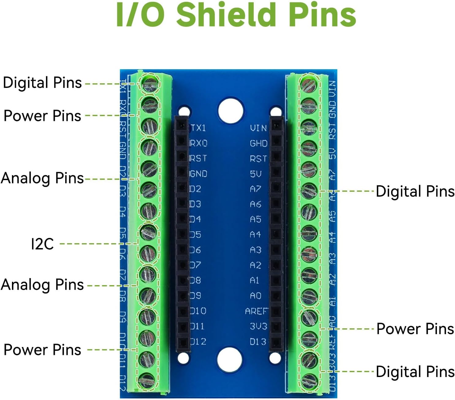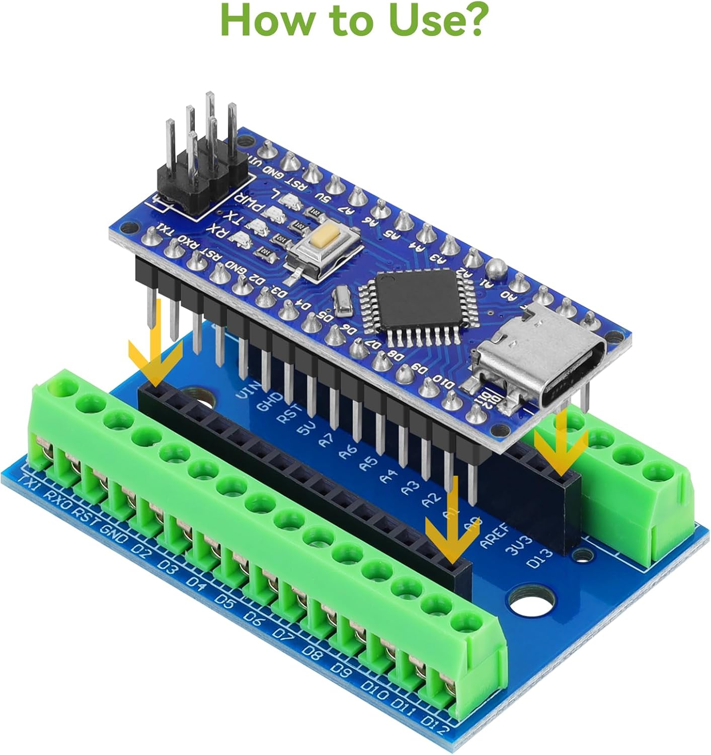 Additional Expansion Board: Nano IO Shield V1.O is a terminal expansion adapter board, working very well for prototyping Arduino Nano projects. You can use this Nano V3.0 expansion board to easily hook up Arduino Nano to an outside world via hook up wires, and It can be used in conjunction with or in place of a breadboard
