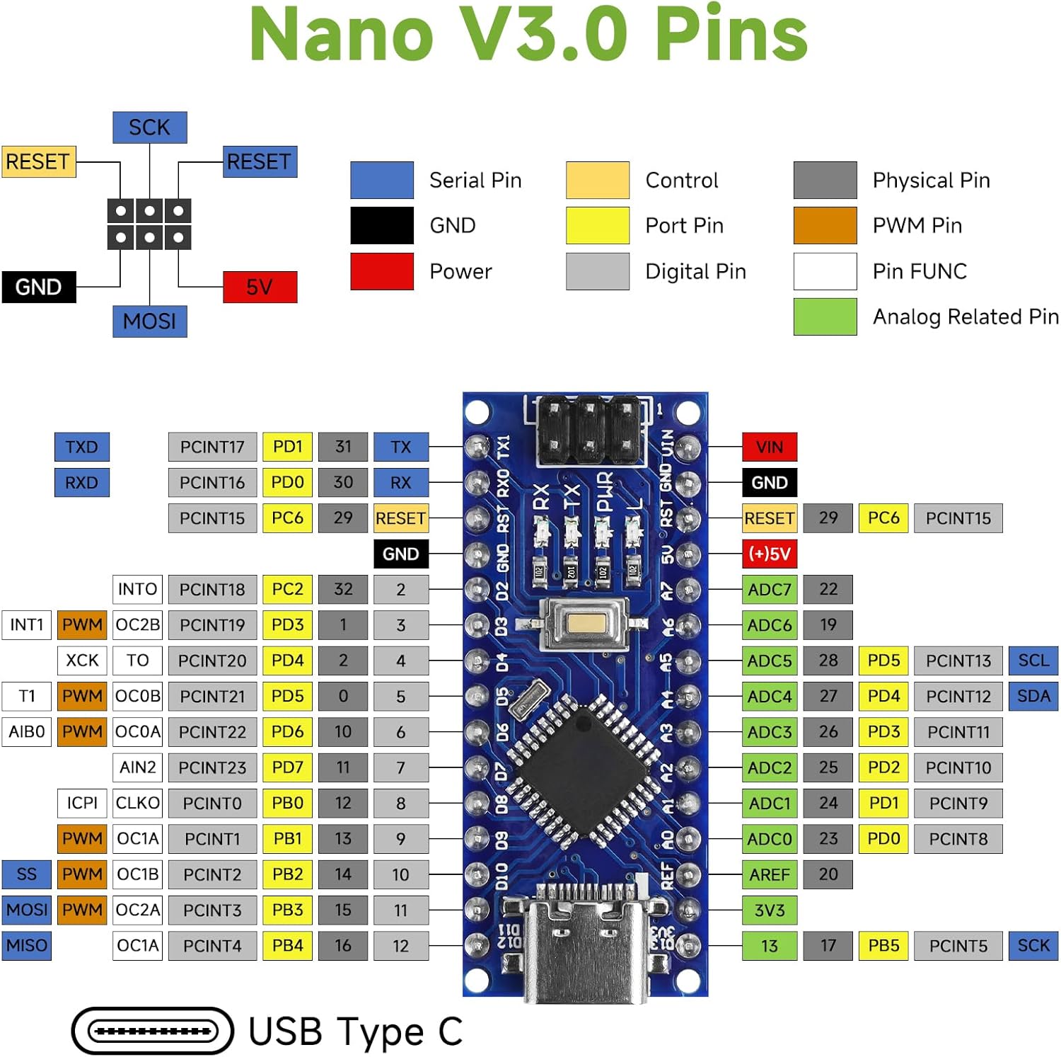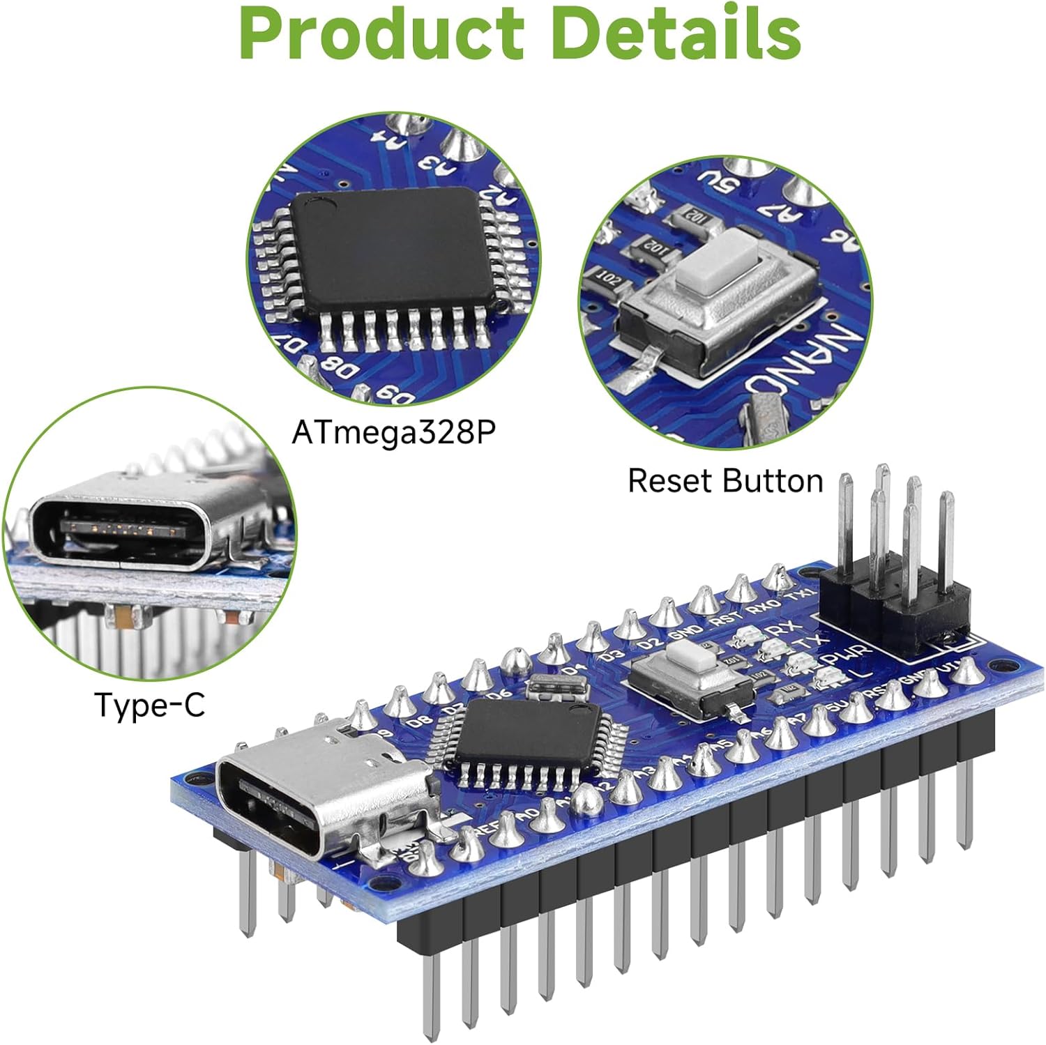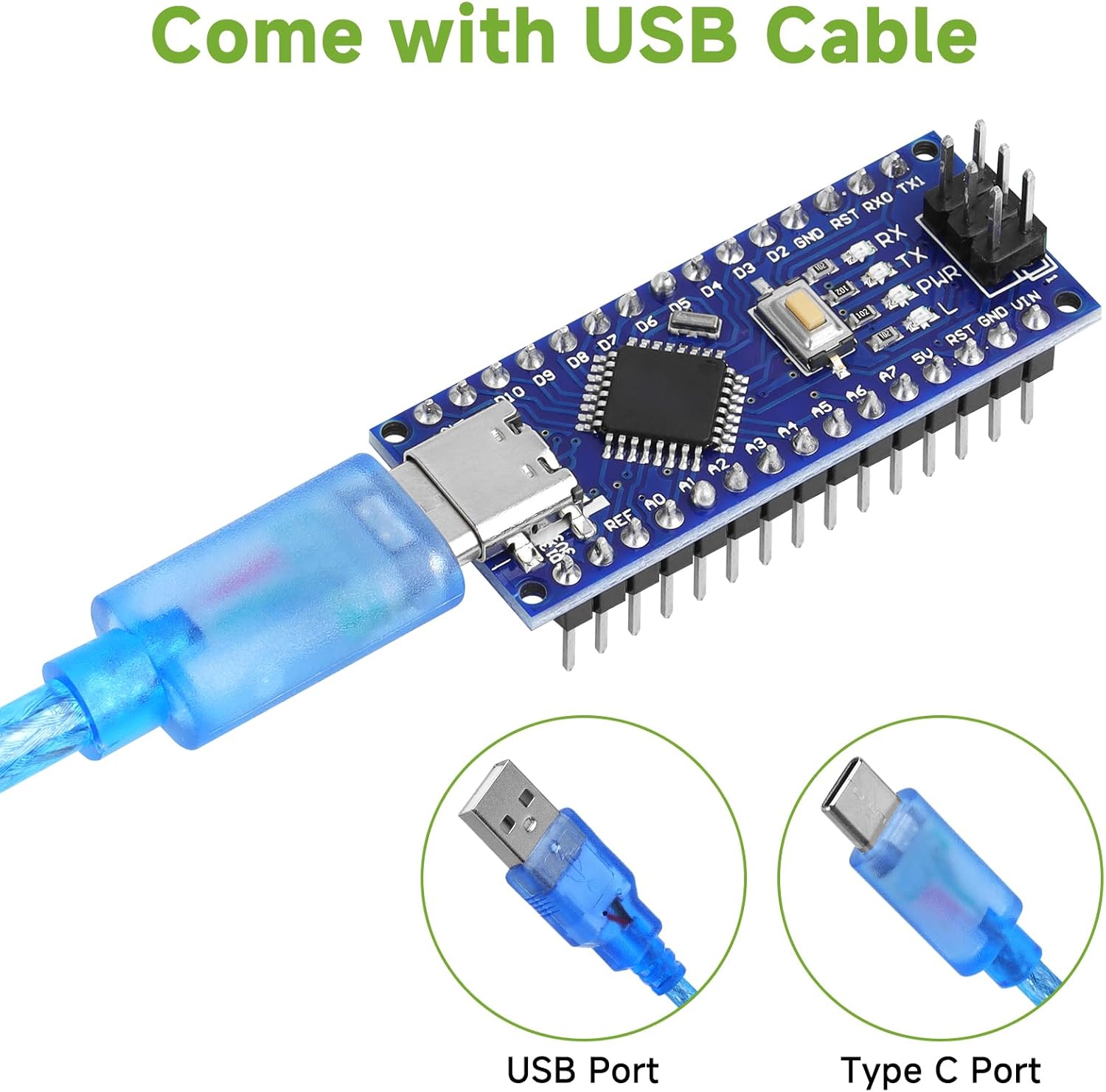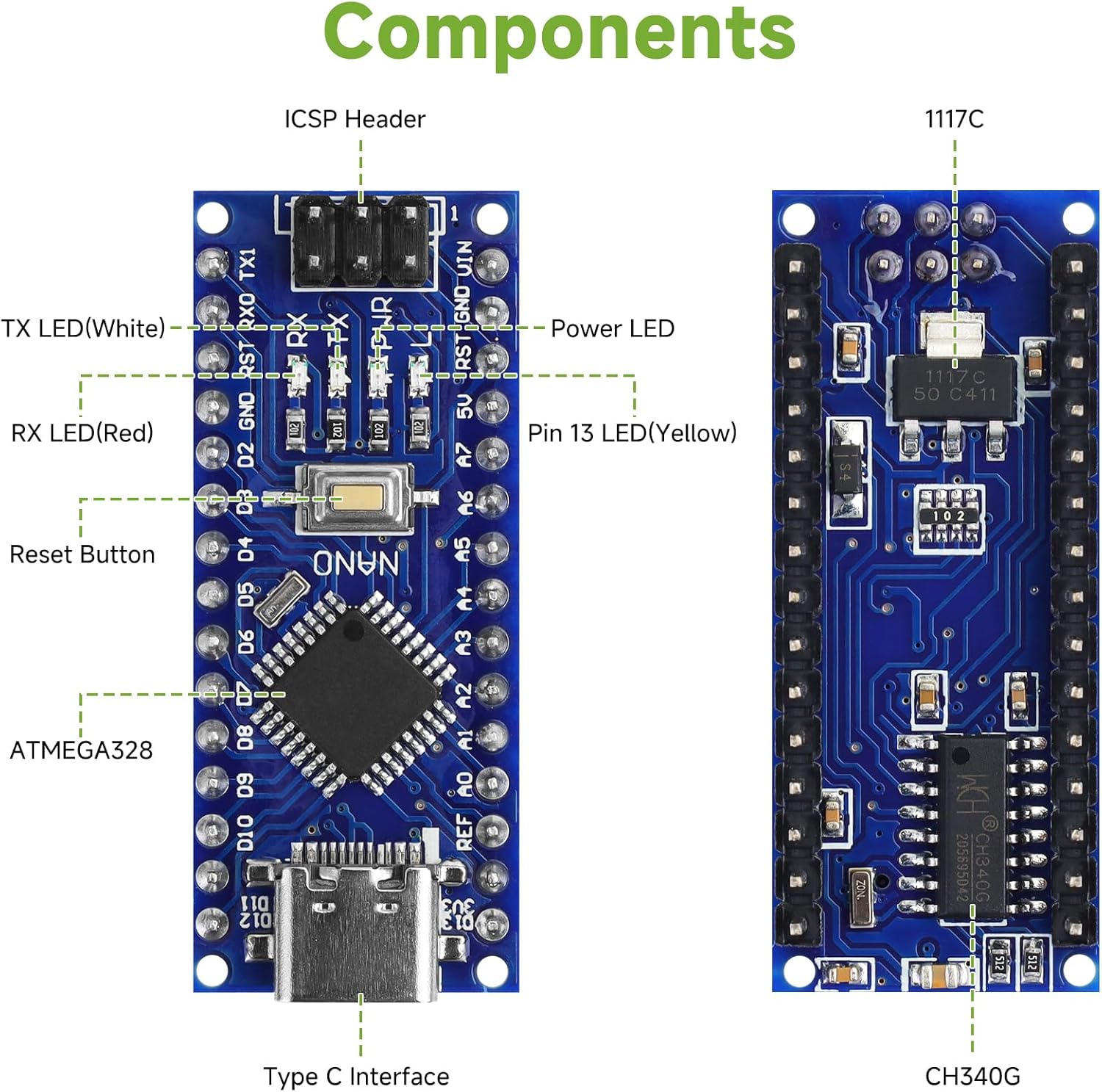 Main Chip: Nano V3.0 board uses ATmega328P-AU as main chip. Support ISP download, USB download and power supply. Fully compatible with Arduino Nano, Windows, MAC and Linux operating systems