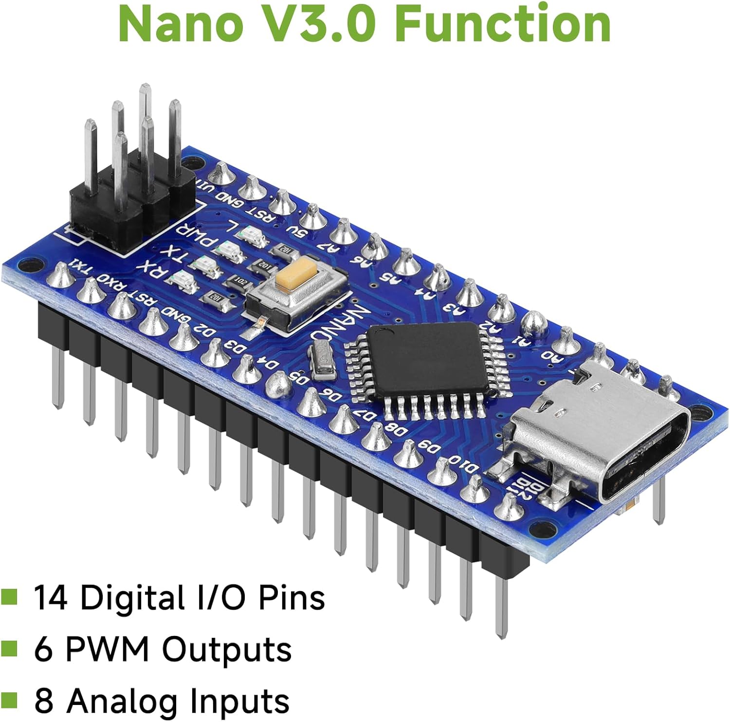 Perfect Design: Nano V3.0 is a smallest, complete and breadboard friendly board. The board has 14 digital I/O pins, 6 PWM outputs, 8 analog inputs. It is enough for most applications