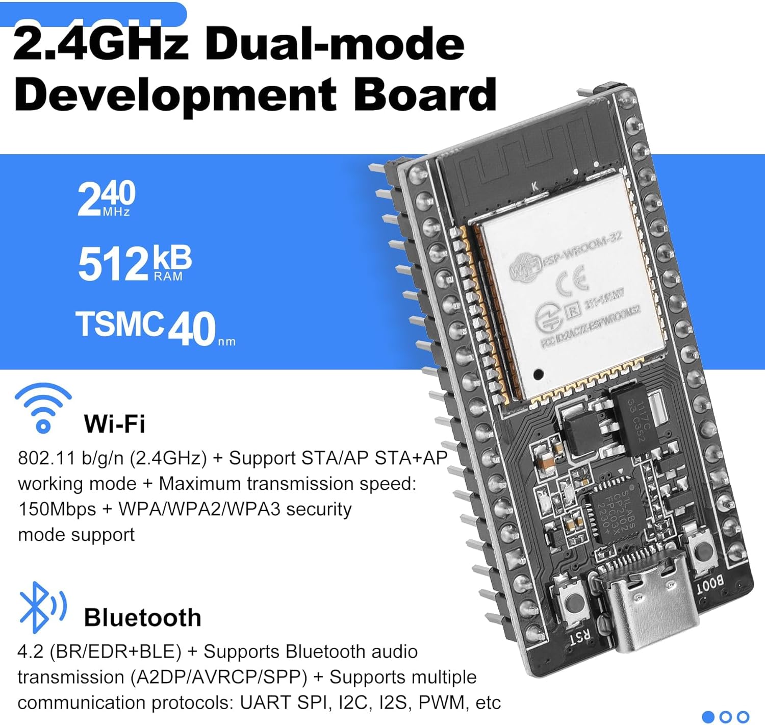 2.4GHz Dual Mode WiFi+Bluetooth Development Board: Built in ESP32-S chip, Xtensa single core 32-bit LX7 microprocessor, supporting clock frequencies up to 240 MHz. 128 KB ROM, 320 KB SRAM, 16 KB RTC SRAM. The chip supports secondary development without the need for other microcontrollers or processors