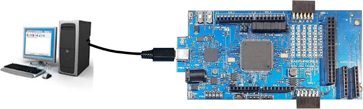 Built in programmer cable allows configuring the FPGA with a single USB-C cable. The DPL can be powered from the USB cable or from the Barrel Connector. A separate JTAG header can also be used to program the FPGA using a compatible USB Blaster cable.