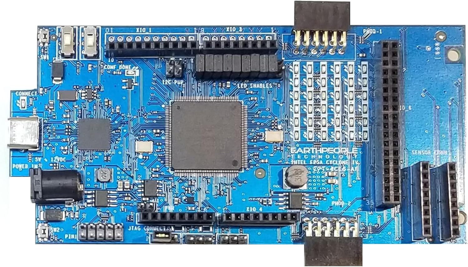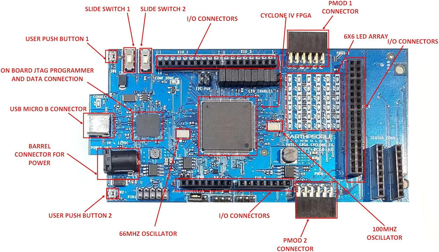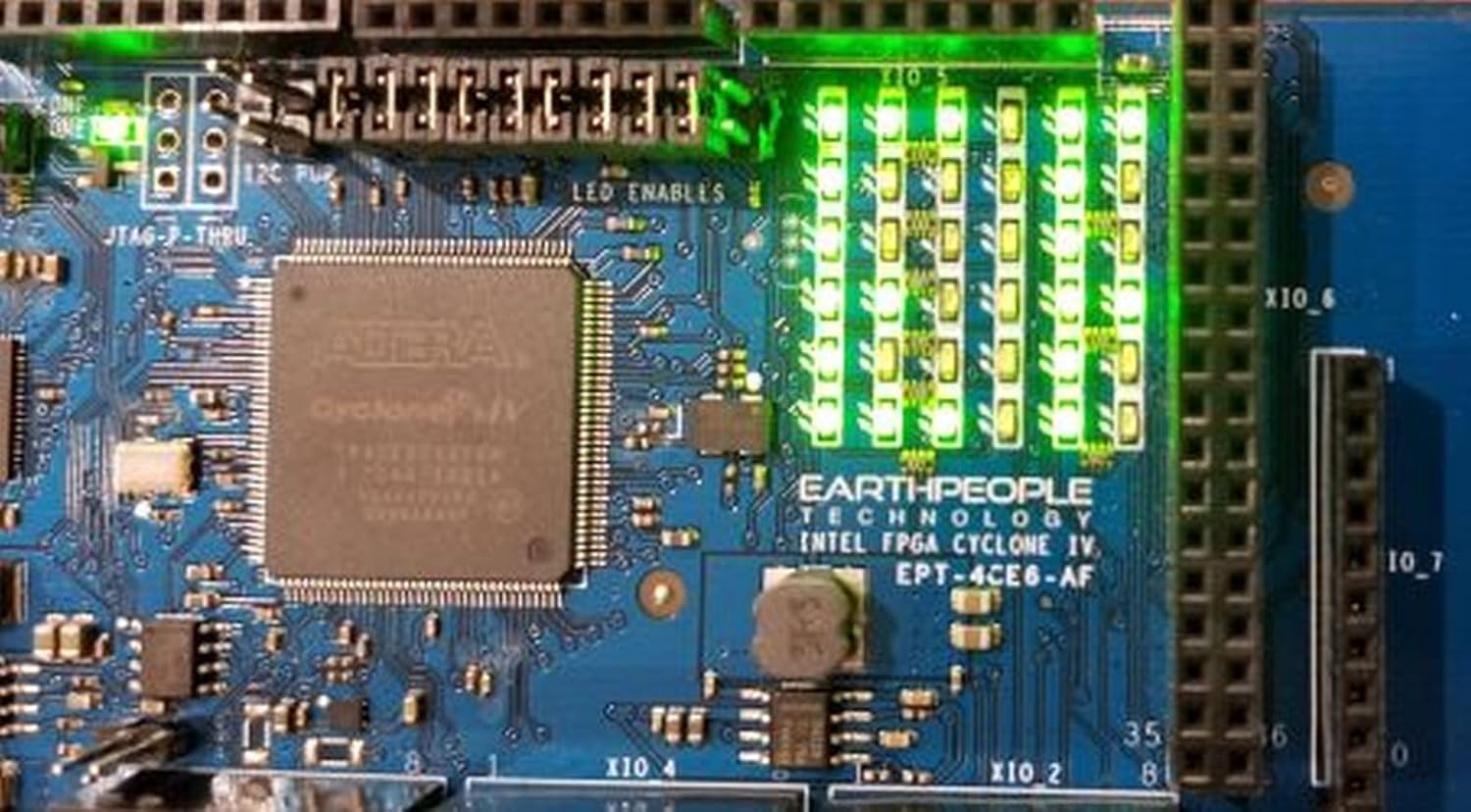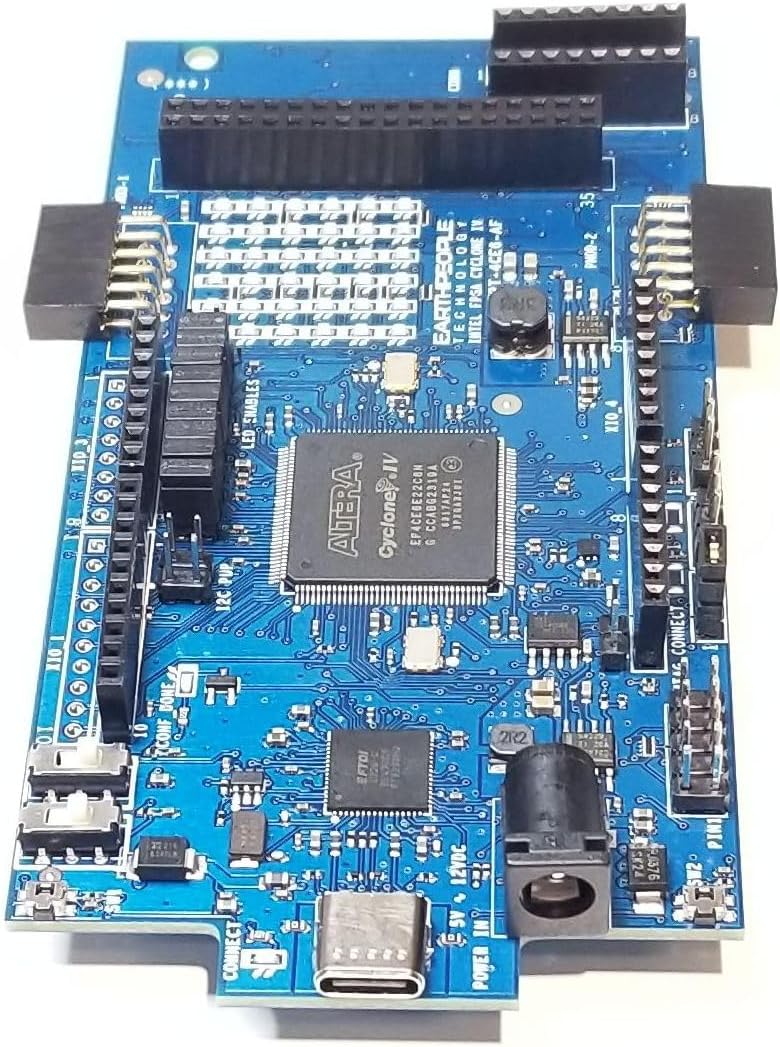Altera Cyclone IV FPGA includes 6,000 Logic Elements with two clock multipliers. The Cyclone IV FPGA is the perfect balance of inexpensive cost versus plentiful logic cells, 20KBytes of SRAM, and General Purpose Input/Output pins. This is a great board to learn how to program FPGA's.