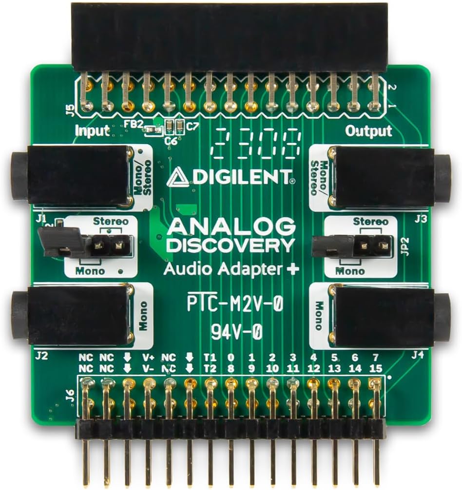 The Audio Adapter+ is a module that allows the Analog Discovery 3 to capture and analyze audio signals from external sources and easily connect audio signals generated by the device to audio devices like headphones and speakers. It is capable of both Mono and Stereo audio, with both types of connectors connected to both the Wavegen and Scope instruments. The Audio Adapter+ is equipped with 2x15 MTE connectors, which makes it compatible with the Analog Discovery 3 and backwards compatible with previous devices in the Discovery family. An additional 2x15 MTE connector is loaded as a pass through for the digital signals, power supplies, and others, so that these other instruments can be used simultaneously to support complex applications.