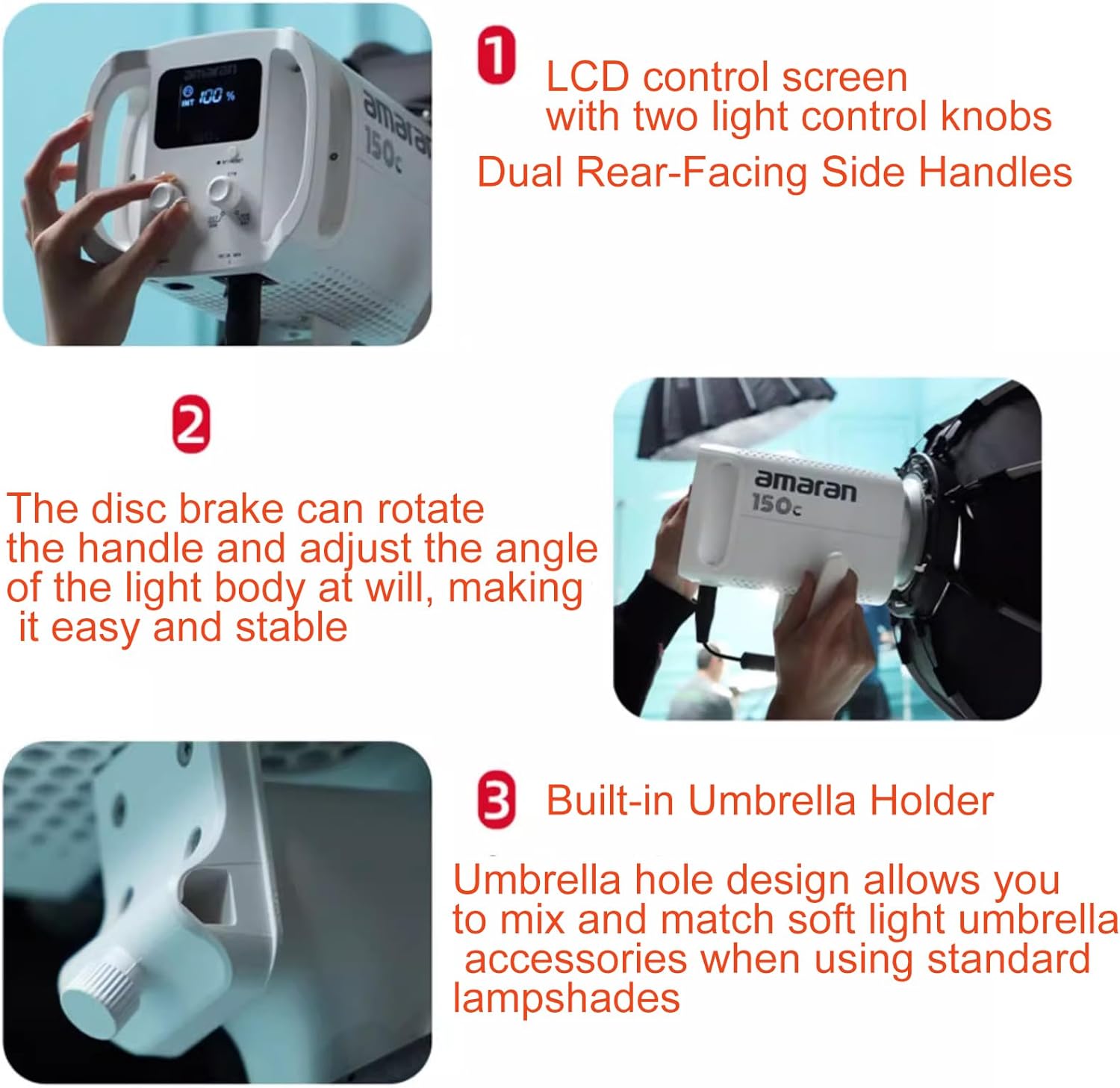 🌟【Easy to Operate for Shooting 】With its 48V DC power input the 150c can freely switch between the AC adapter for studio shoots or the flexibility of battery power using with the Aputure 2-Bay Battery Power Station (sold separately). The Amaran 150c removing the need for a control box. The dual rear-facing side handles and redesigned Bowens Mount release latch even allow for ergonomic adjusting of the fixture wherever it is rigged.
