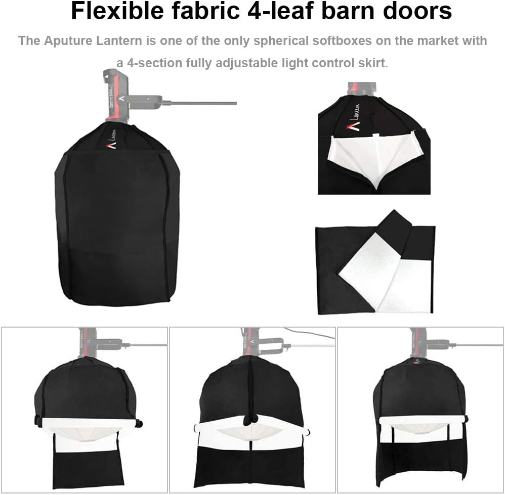 The Art of Control: The Aputure Lantern features a 4-section adjustable light control skirt with a hook-and-loop for quick attachment in any position,allows for precise control of soft light, you can roll the skirt up or down to flag off unwanted light.