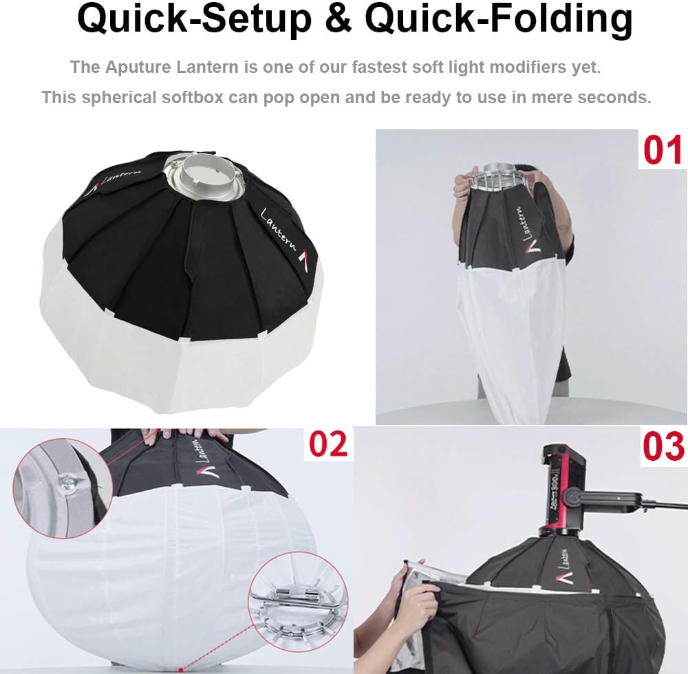 Quick-Setup & Quick-Folding:The Aputure Lantern can pop open and be ready to use in mere seconds. With the Lantern will you'll be able to produce soft even light wherever your shoots may take you.