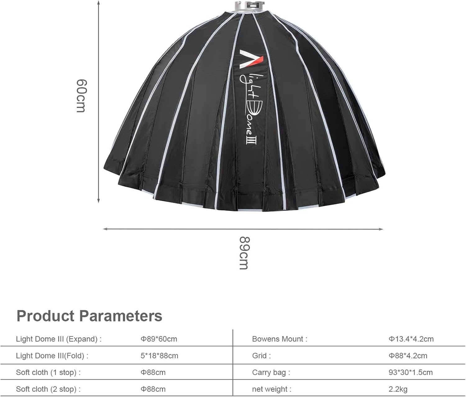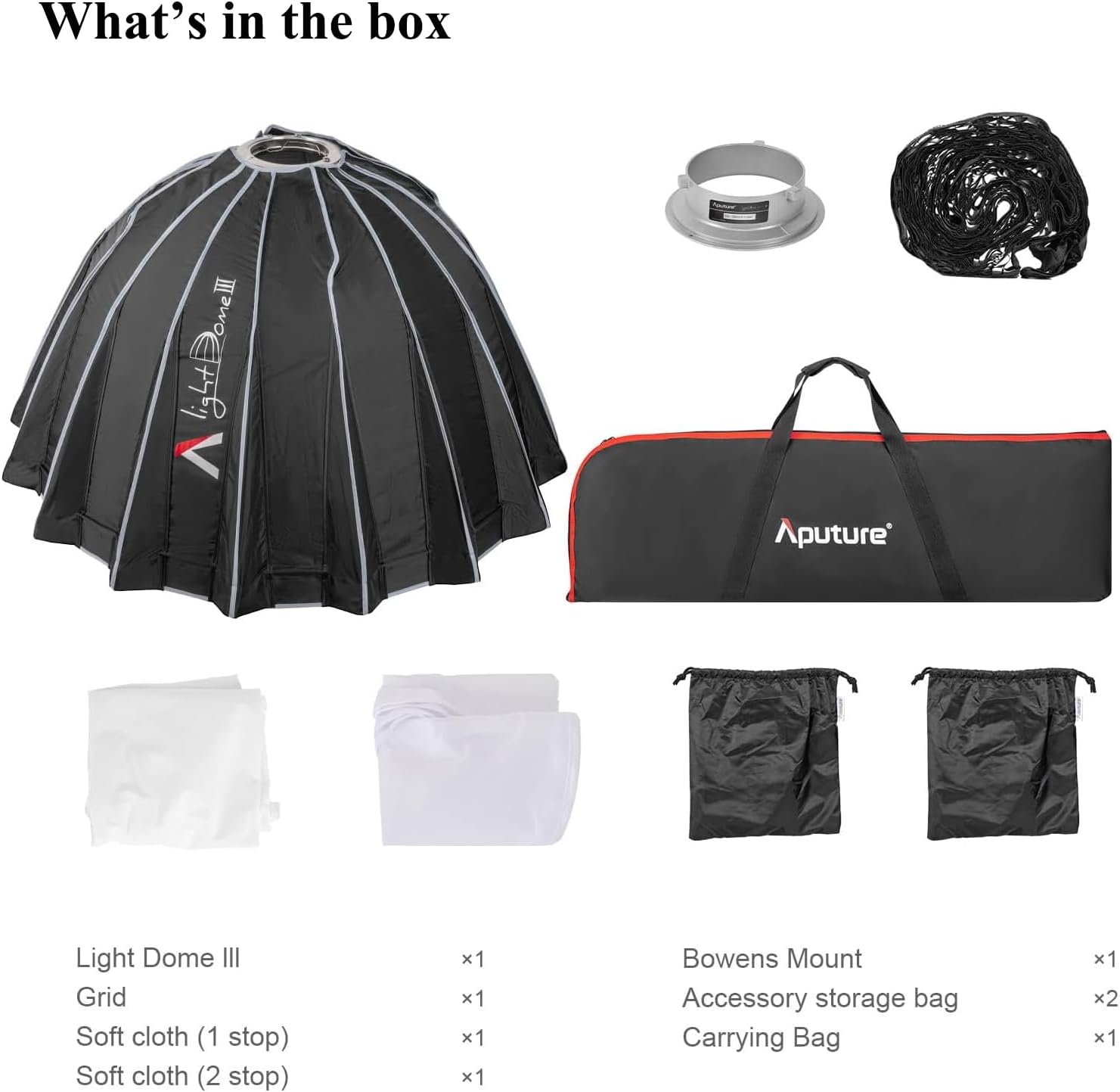 💡【Size】The Light Dome III is the flagship softbox for Aputure’s Bowens Mount lights, featuring the same 3ft (88cm) circular shape with a brand new quick-folding, flat-pack design.From film sets to broadcast studios, product photography to live streaming, the Light Dome III satisfies the professional soft lighting needs of creators in a wide range of shooting environments