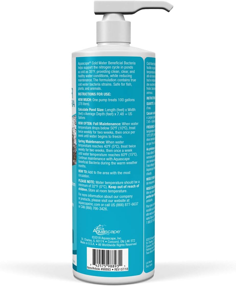 Aquascape Cold Water Beneficial Bacteria for Ponds helps to provide clean, clear, and healthy water conditions in water as cold as 35-degrees Fahrenheit, significantly reducing pond maintenance required. Each bottle of Aquascape Beneficial Bacteria is packed full of eight pure strains of concentrated bacteria and is completely safe for fish, plants, pets, and wildlife. Our Beneficial Bacteria will effectively reduce ammonia, nitrite, and waste in the pond, allowing you to spend more time enjoying your water feature and less time maintaining it.