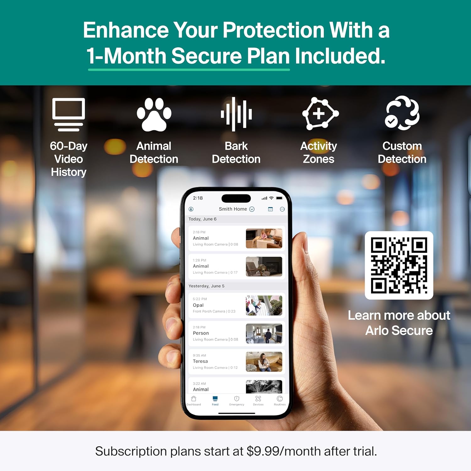 Enhanced Protection with 1-Month Secure Plan Included: Access 60-Day video history, Custom Alerts, Advanced Audio Detection, Smart Detection, Activity Zones, 24/7 Emergency Response & more. After trial, subscription plans start at $7.99/month (billed annually).