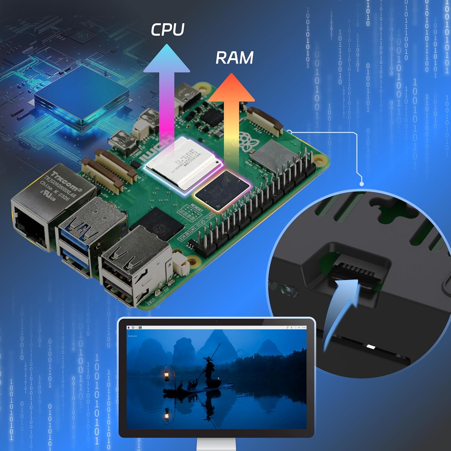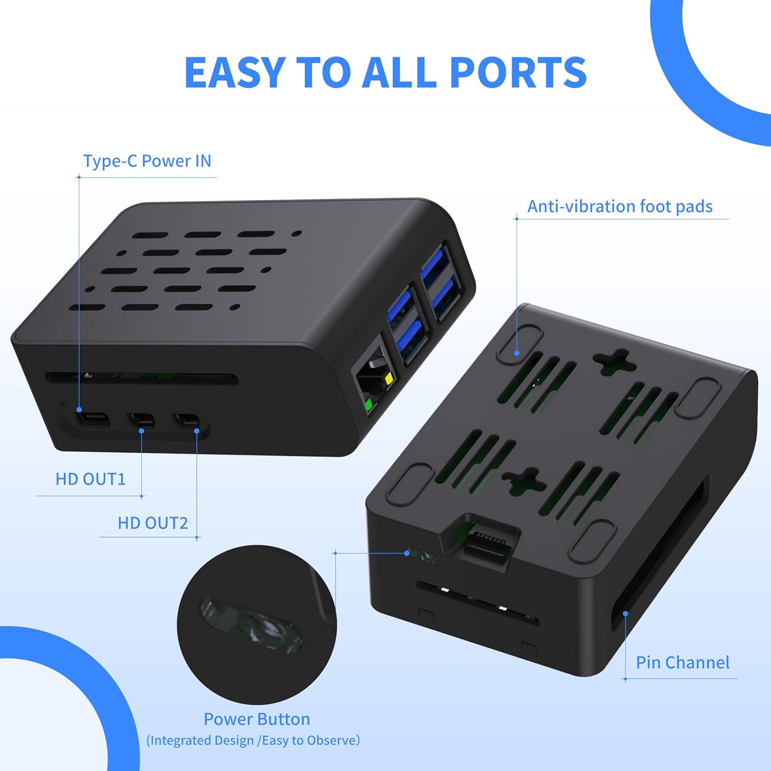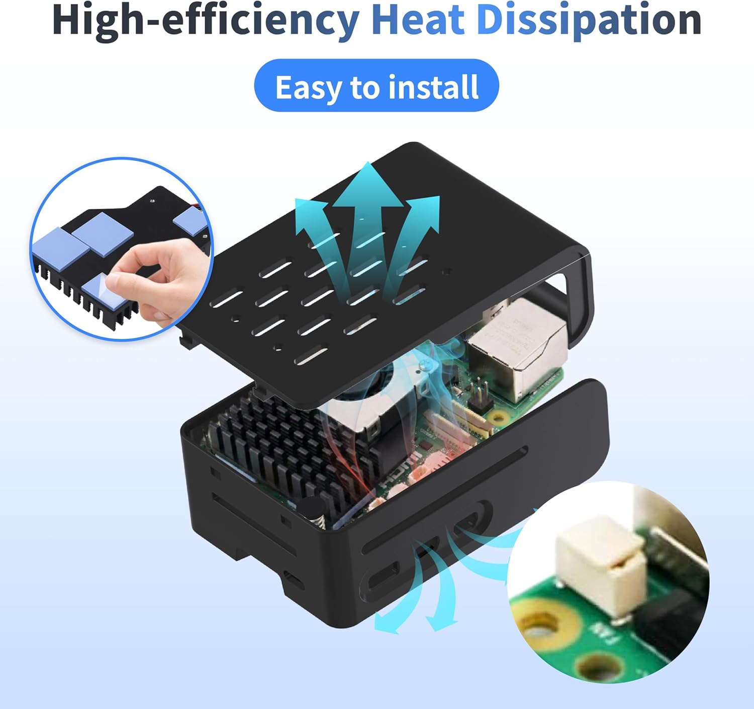 High-Efficiency Active Cooling System: The active cooler anodized aluminum in tandem with a PWM-controlled fan, paired with a specially designed ventilated case. This combination rapidly reduces chip temperatures, ensuring the Pi 5 consistently operates at peak performance. Even during high-load scenarios like 4K video decoding and programming development, the system maintains continuous stability without throttling.