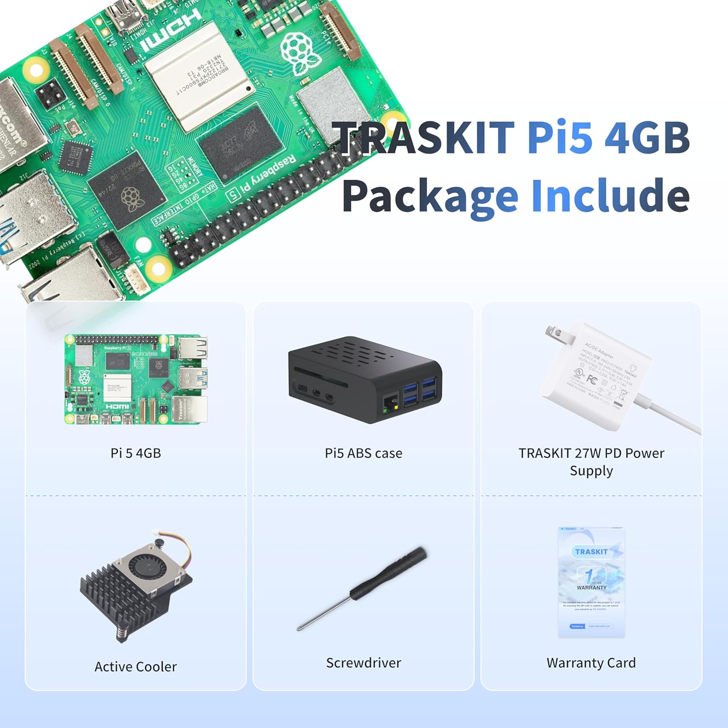 Basic Kit: The TRASKIT Kit takes the hassle out of preparation, letting you focus on creation and bring your ideas to life quickly.Package Includes: 1x Pi 5 4GB,1x Pi 5 Case,1x Active Cooler,1x 27W USB-C PD Power Adapter,1xScrewdrive,1x Warranty Card,1x Installation Card.