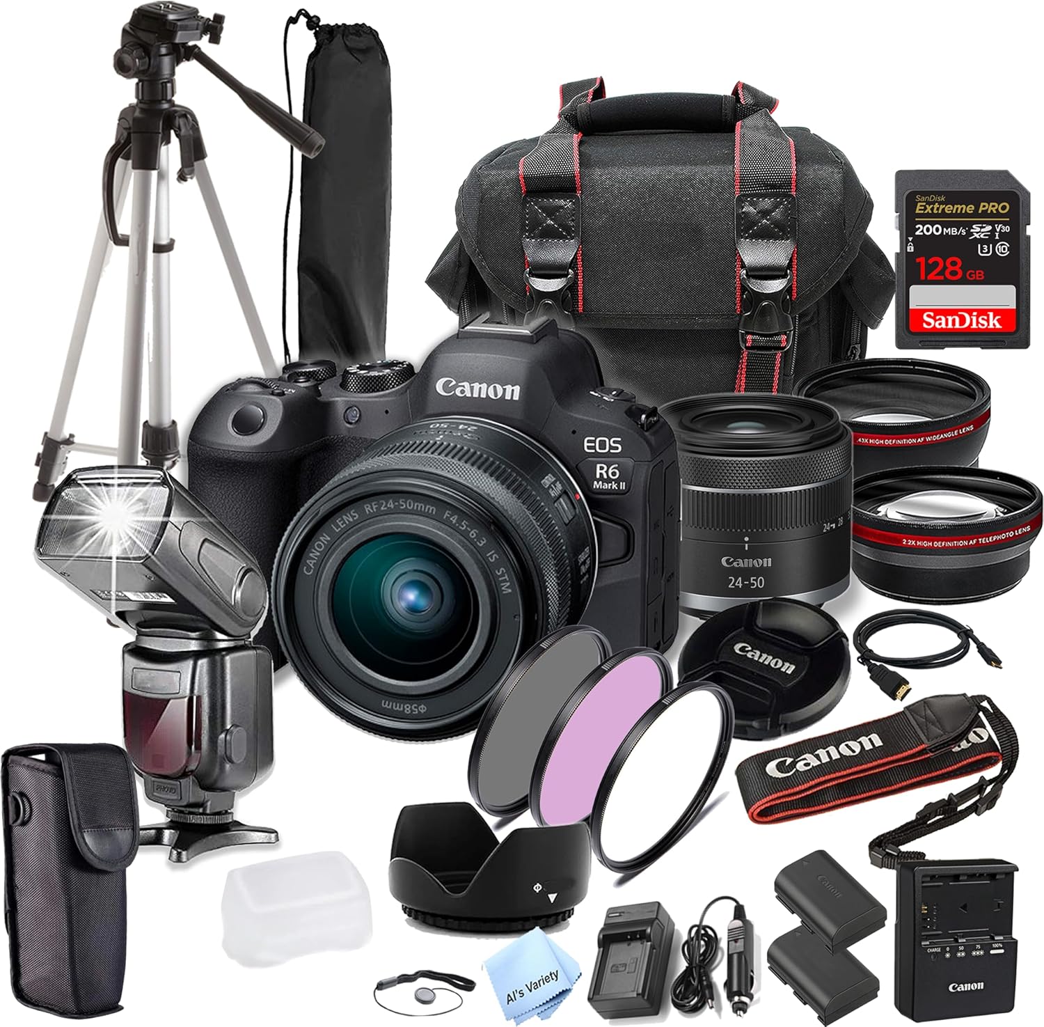 Canon EOS R6 Mark II with 24-50mm + 128GB Extreme Speed Card, Camera Case, Tripod,TTL Speedlite, Spare Battery, Filter Kit, and More (Extreme Pro-Bundle) (Renewed)