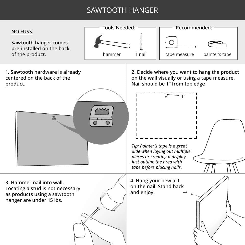 READY TO HANG: Your canvas comes with pre-installed hanging hardware already attached to the back of the product. Once the item arrives, all you need to do is hang it on a nail. We also include instructions for measuring and hanging with your product to make the process as easy as possible. We strongly recommend using a nail, rather then adhesive tape or tabs.