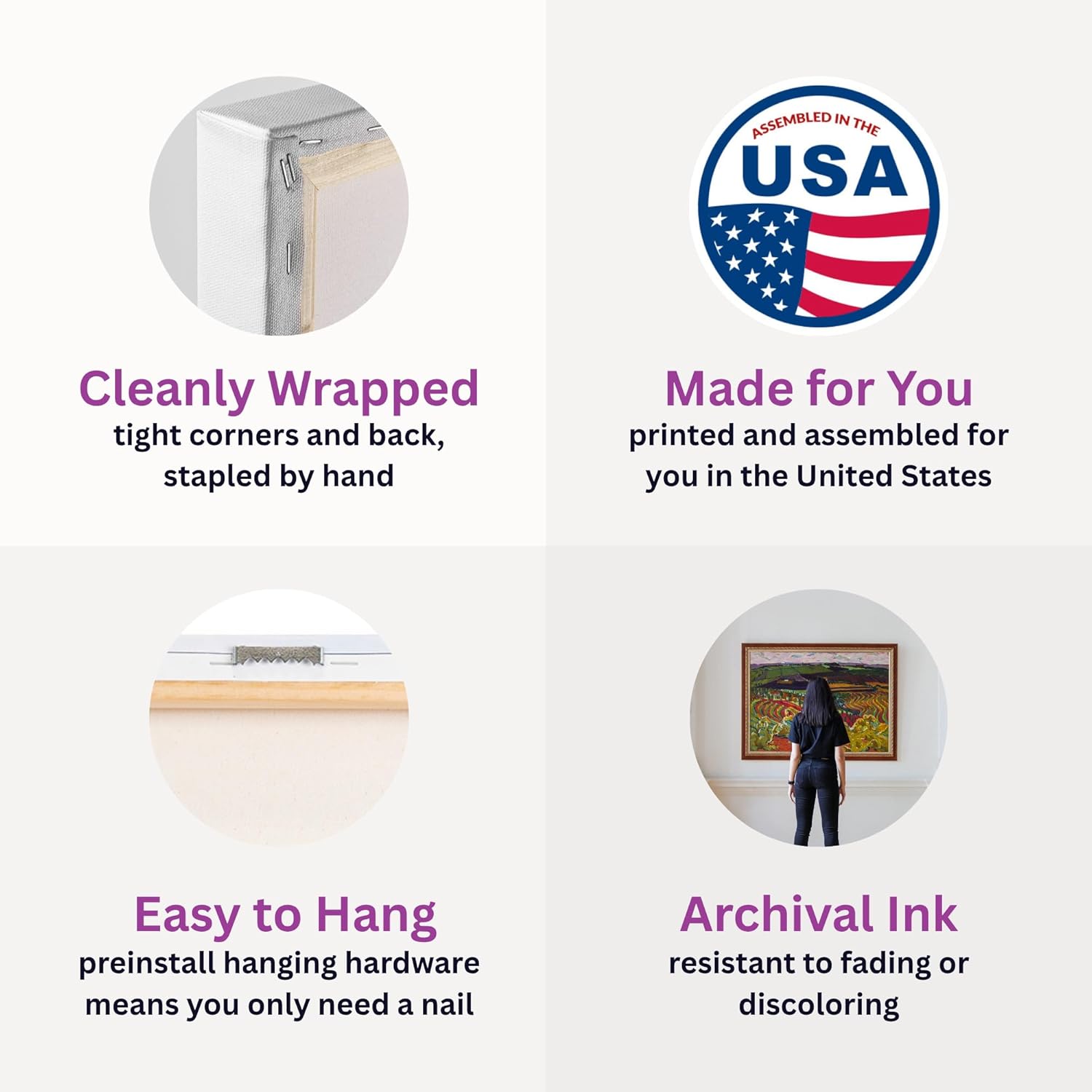 HANDCRAFTED WITH CARE: Our items are printed and assembled in the United States of America! Each of our wrapped canvas prints are stretched and stapled by highly-skilled craftspeople, ensuring that the canvas is pulled tight and has clean, professional corners. Once completed, our frame professsional fits your canvas with a float frame for the polished, modern look. We pride our items' outstanding longevity, quality, and durability, and art proud to manufacture in the USA.