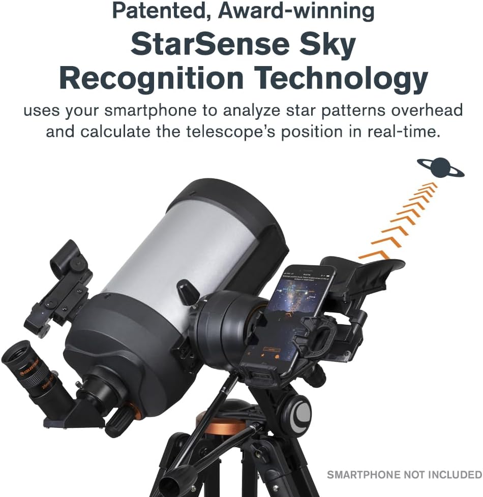 Celestron’s StarSense Explorer DX 5-inch is the first telescope that uses your smartphone to analyze the night sky and calculate its position in real time, making stargazing easier than ever. Perfect for beginners, this app-enabled telescope lets you dock your phone, launch the app, and follow on-screen arrows to planets, stars, galaxies, and more. Unlike other astronomy apps that rely solely on gyroscopes, StarSense uses patented sky recognition technology and a Lost in Space Algorithm (LISA)—like the sophisticated location systems used by satellites—to deliver accurate, real-time guidance. Simply align your phone with the telescope optics, and within minutes, you’ll be exploring with confidence. The app automatically generates a list of the best objects to view based on your exact time and location. Choose one and navigate there by following the on-screen arrows. When the bullseye turns green, your target is ready in the eyepiece. The high-quality 130mm Schmidt-Cassegrain with StarBright XLT coatings provides impressive, detailed views of the Moon, Jupiter, Saturn, Mars, and deep-sky favorites like the Orion Nebula and Andromeda Galaxy. Includes two eyepieces (10mm and 25mm), an erect image diagonal, a red dot finderscope, a full-height tripod, and a StarSense smartphone dock. StarSense Explorer works with most modern smartphones; it is compatible with Android 12 and later, as well as iOS 18 and newer, including iPhone XR and newer models.