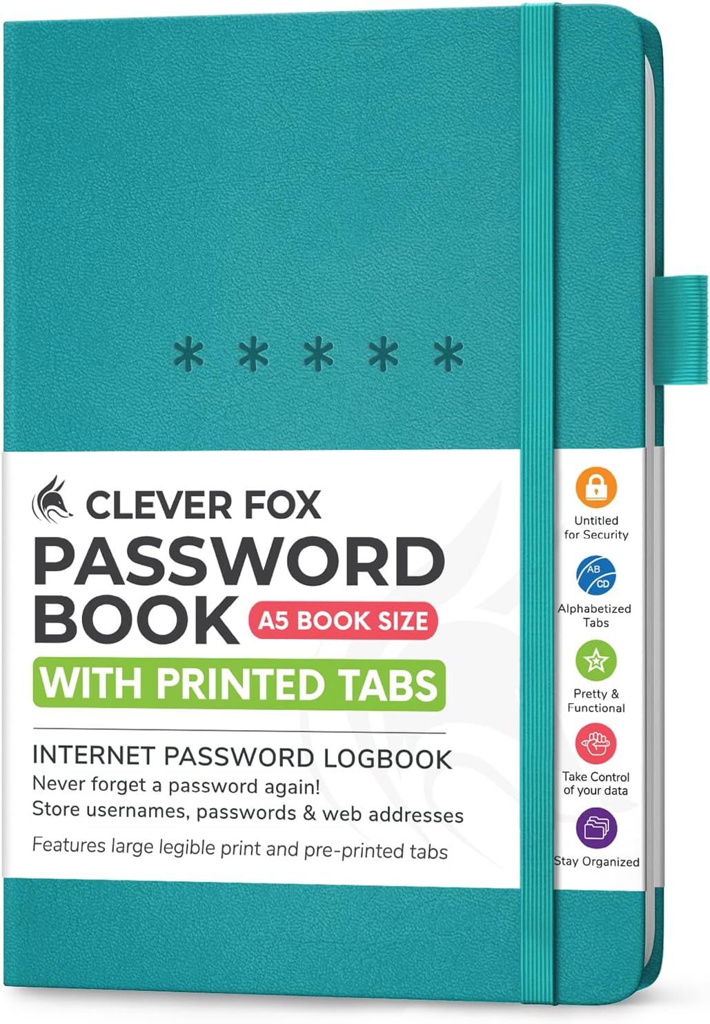 Clever Fox Password Book – Alphabetized Internet Address & Password Organizer – Computer & Website Password Keeper Notebook – Log-In Password Journal - Medium, A5, 8.3x5.8″, Hardcover (Turquoise)