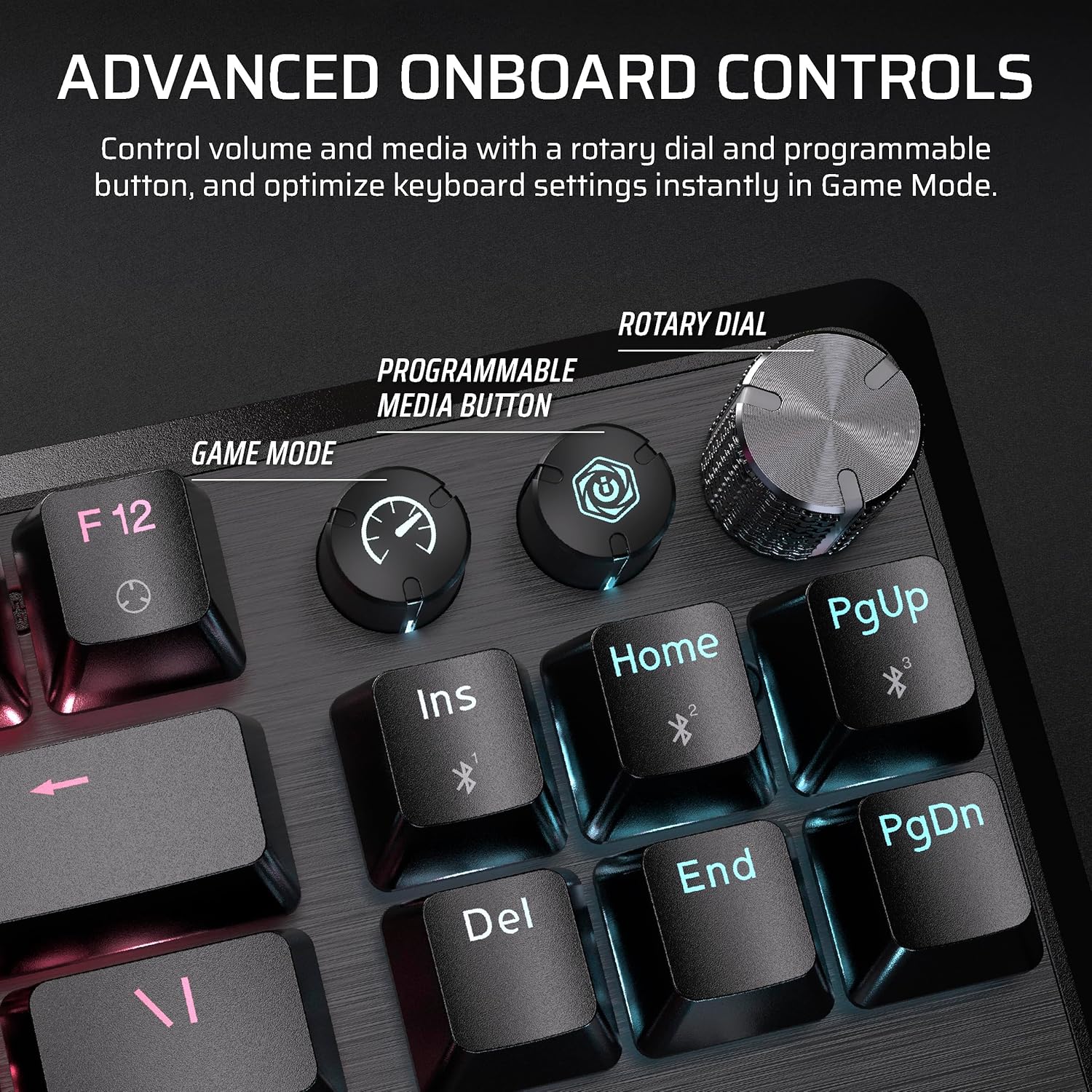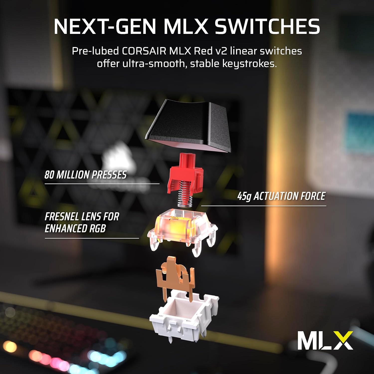 Pre-Lubed MLX Red v2 Switches: Pre-lubricated CORSAIR MLX Red v2 linear mechanical switches deliver smooth, responsive, and stable keystrokes, with enhanced ultra-bright per-key RGB backlighting.