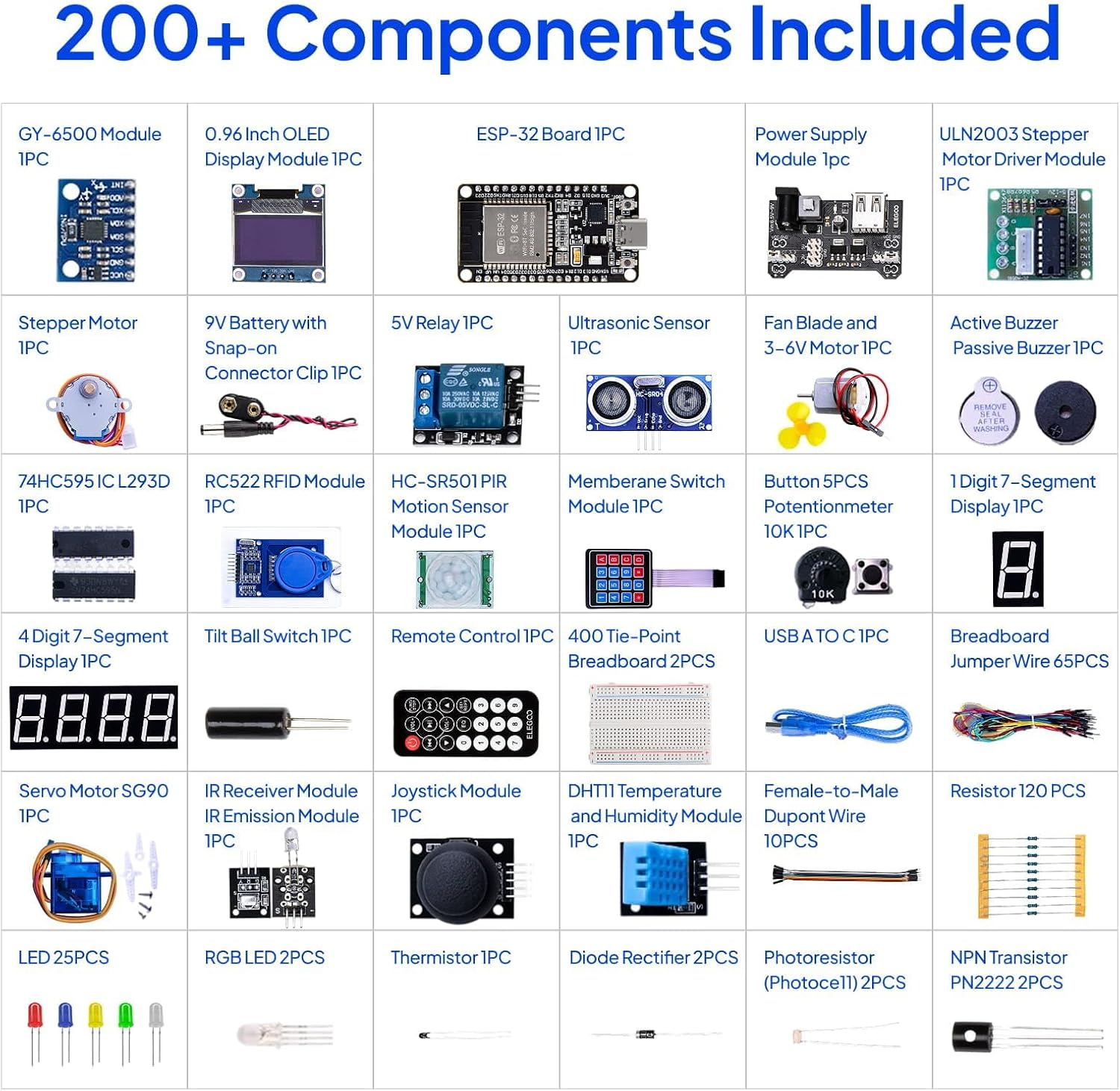 ESP-32 Board × 1; 0.96 Inch OLED Display Module × 1; GY-6500 Module × 1; Power Supply Moudle ×1; ULN2003 Stepper Motor Driver Module ×1; Stepper Motor ×1; Servo Motor SG90 ×1; 5V Relay ×1; IR Receive Module ×1; IR Emission Module ×1; Joystick Module ×1 ; DHT11 Temperature and humidity Module ×1; Ultrasonic Sensor ×1; Fan Blade and 3-6V motor ×1; Active Buzzer ×1; Passive Buzzer ×1; 74HC595 ×1; L293D ×1; Rc522 RFID Module ×1; Membrane Switch Module ×1; HC-SR501 PIR Motion Sensor Module ×1; Button ×5; Potentiometer 10K ×1; 1-Digital-7-SegmentDisplay ×1; 4-Digital-7-SegmentDisplay ×1; Tilt Ball switch ×1; Remote Control ×1; 400 Tie -Points Breadboard ×2; USB A -TO -C ×1; Female-to -male Dupont Wire ×10; Breadboard Jumper Wires ×65; 9V Battery with Snap-on Connector Clip ×1; Resistor 10Ω×10; Resistor 100Ω×10; Resistor 220Ω×30; Resistor 330Ω×10; Resistor 1kΩ×10; Resistor 2kΩ×10; Resistor 5k1Ω×10; Resistor 10kΩ×10; Resistor 100kΩ×10; Resistor 1MΩ×10;Red LED ×5; White LED ×5; Blue LED ×5; Green LED ×5; Yellow LED ×5; RGB LED ×2; Themistor ×1; Diode Rectifier ×2; Photoresistor(photocell) ×2; NPN Transistor PN2222 ×2