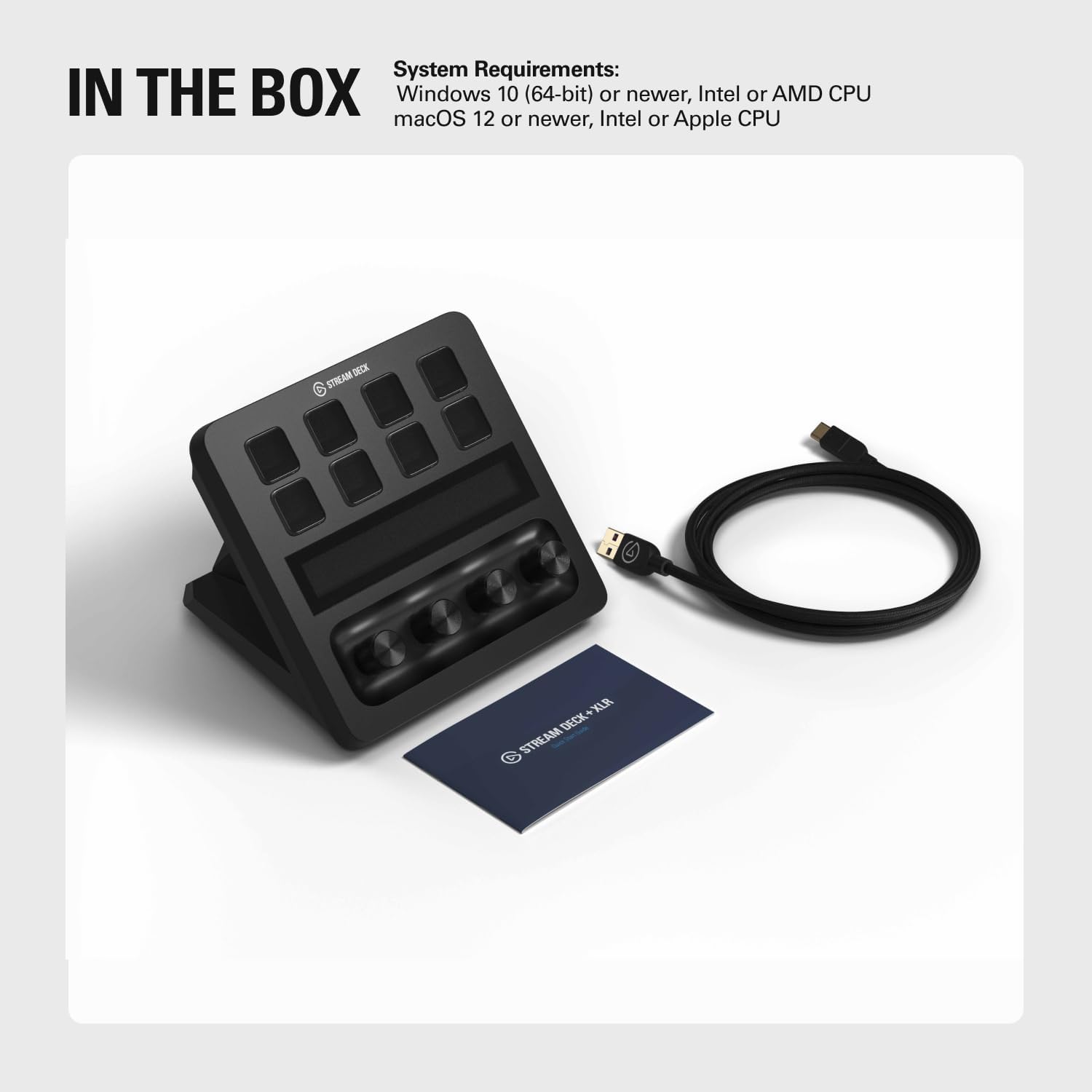 Iconic Stream Deck tech, plus dials and a built-in mic interface. Stream Deck + XLR is your audio mixer, workflow controller, live console—anything you want it to be. Customize your deck with digital plugins and profiles to streamline workflows. In the back, a studio-grade interface ensures your XLR microphone sounds loud and clear. Technical Specifications: Keys: 8 x customizable LCD keys Multifunction Dials: 4 x 360° encoders with push function LCD touch panel: 108 x 14 mm / 4.2 x 0.5 in Interface: USB 2.0 Frequency response: 20Hz–20kHz Dynamic range: 100dB (120dB with Clipguard) Equivalent input noise (EIN): -130dBV at 60dB gain Gain range: 0–75dB Phantom power: 48VDC, 7mA Max input level: 10V at 0dB gain (with Clipguard) Max output level: 77mW Resolution: 24-bit Sample rate: 48kHz Interface: USB 2.0 Type-C Dimensions: 5.51 in (D) x 5.43 in (W) x 4.37 in (H) / 140mm (D) x 138 mm (W) x 111 mm (H) Weight: 0.97 lb / 440 g System Requirements: Windows 10 (64-bit) or later, macOS 13 or later In The Box: Stream Deck + XLR, USB-C to USB-A Cable (150 cm | 59 in), Quick Start Guide
