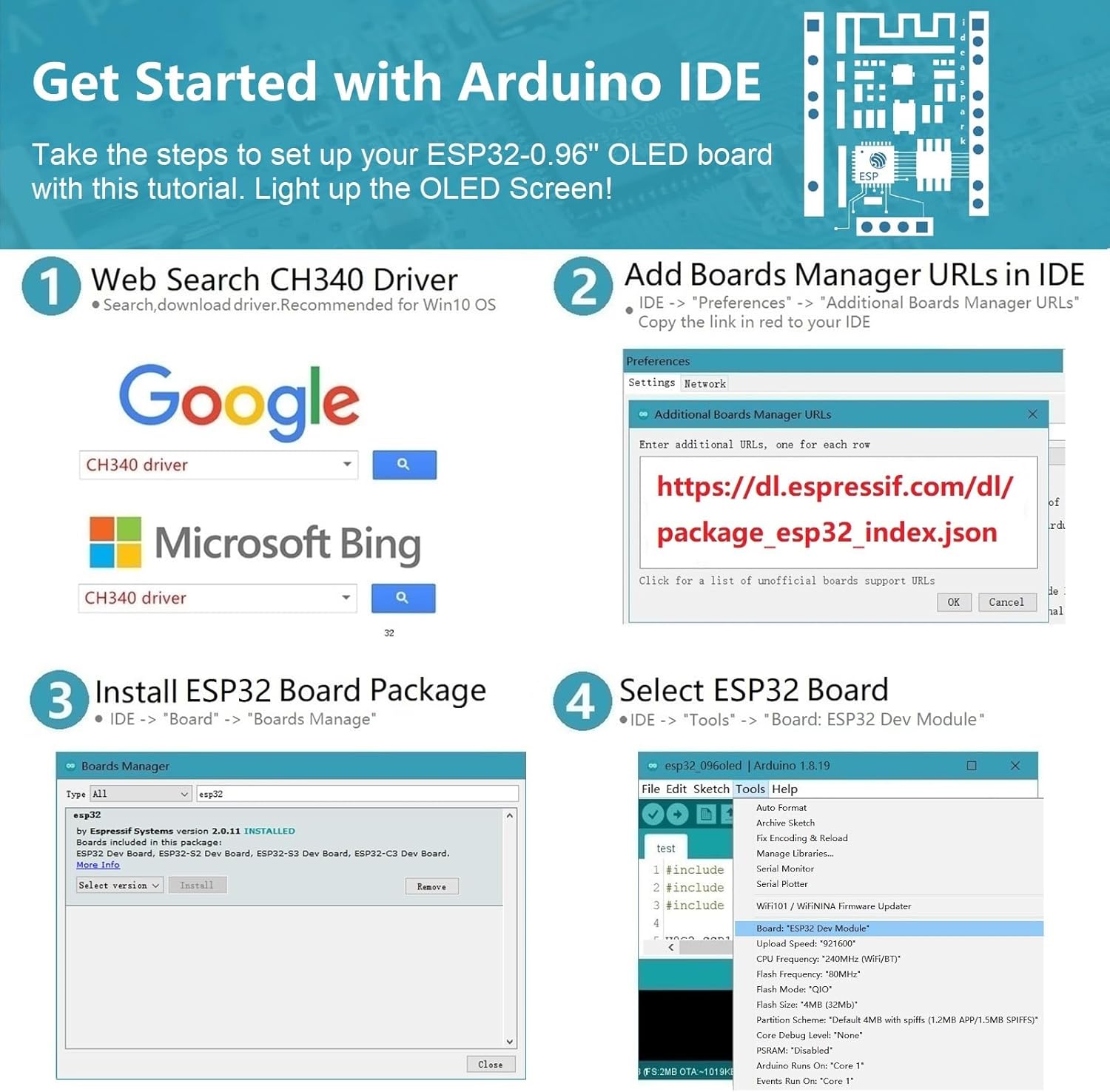 Refer to the 4th Picture and 5th picture above. Download the driver, connect board to the computer with Micro USB cable, configure the IDE, and upload the code to board