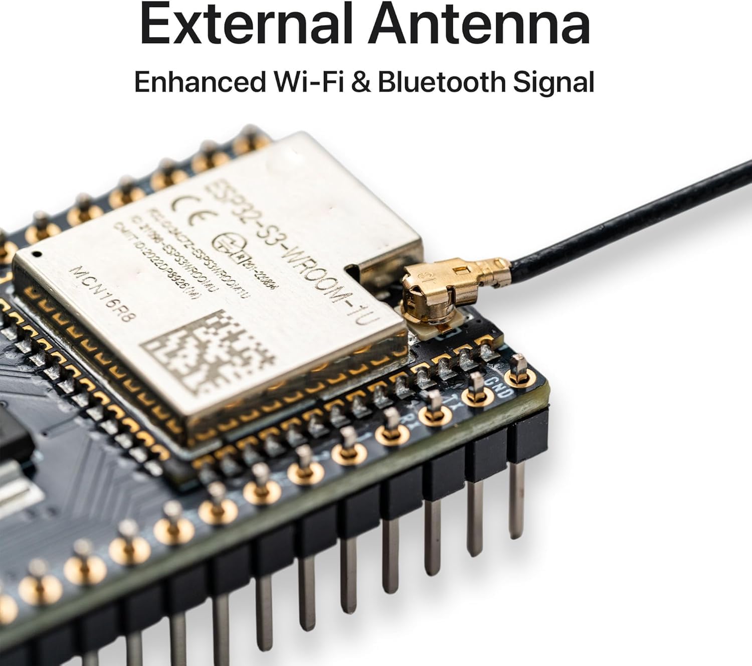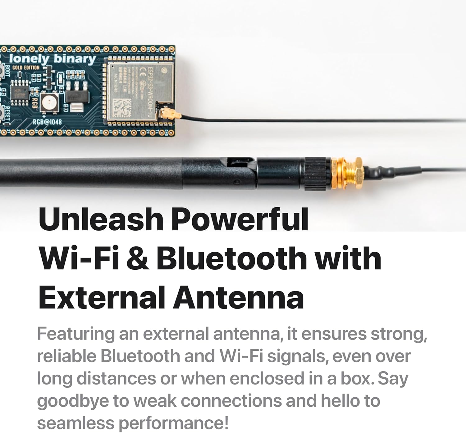 The IPEX external antenna ensures exceptional Wi-Fi and Bluetooth signal strength, providing extended range and reliable connectivity for IoT and wireless projects.