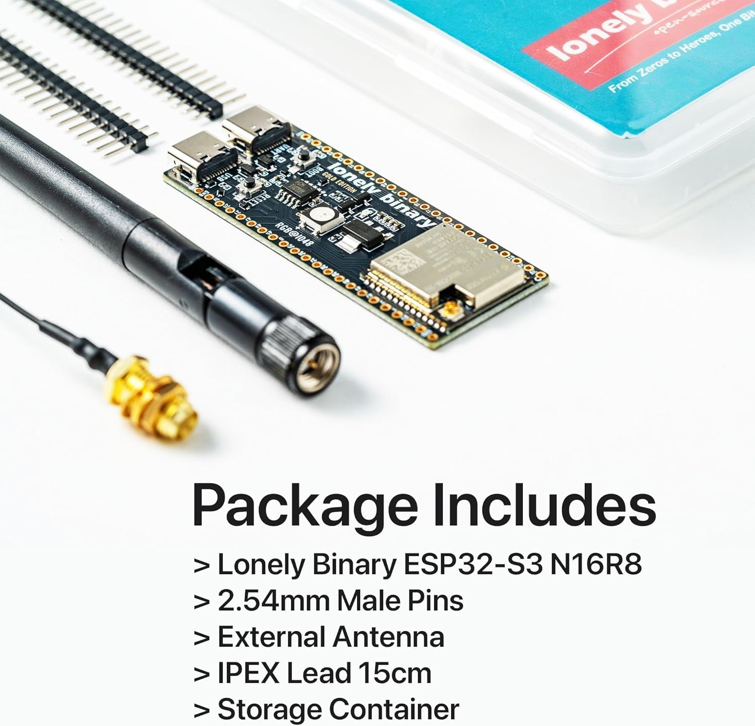 1 x Lonely Binary ESP32-S3 N16R8 IPEX Development Board (Unsoldered Pins) - High-performance board with ESP32-S3 module for advanced IoT projects.2x 2.54mm Male Pin Headers - Standard headers for easy prototyping and connectivity.1x IPEX Antenna - Enhances Wi-Fi and Bluetooth signal strength and range.1x IPEX Cable - Connects the antenna to the board for optimal performance.1 x Storage Plastic Container - Keeps components safe and organized during storage or transport.