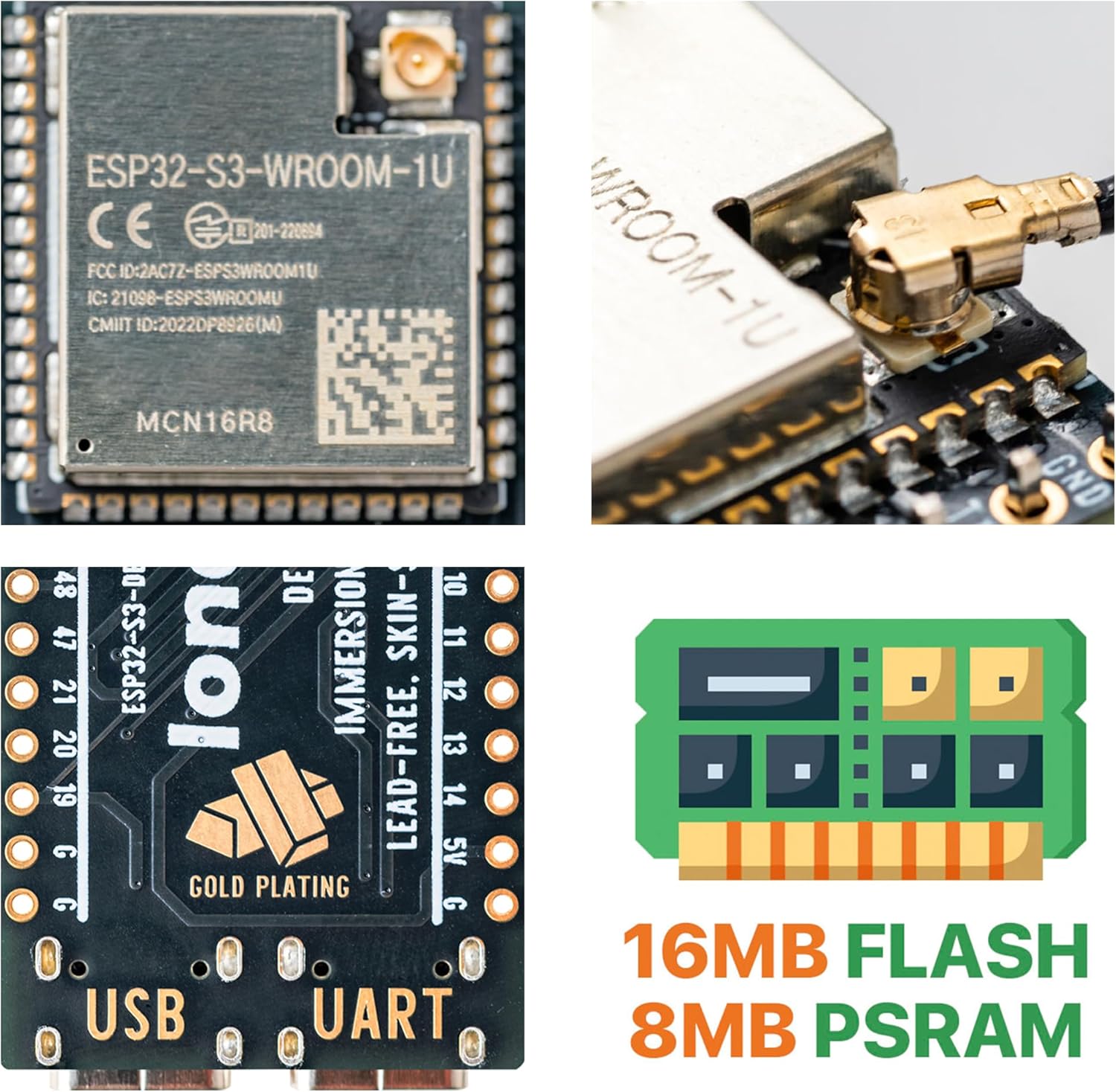 ESP32-S3 Development Board Gold Edition 16MB Flash 8MB PSRAM Dual USB-C IPEX Antenna WiFi Bluetooth for Arduino IoT Projects, MicroPython & ESP-IDF N16R8 (16MB +Antenna Gold Edition)
