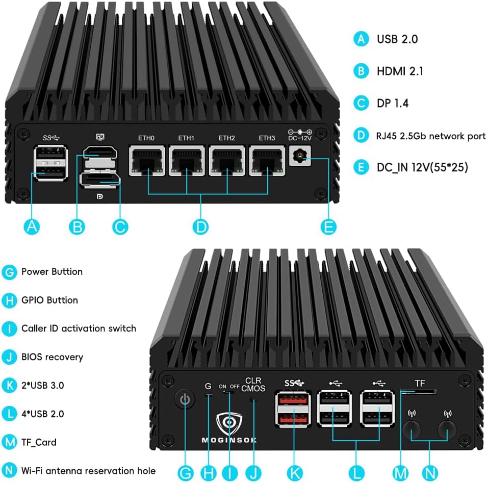 ✅【Professional Firewall PC MGSRN305】MOGINSOK Firewall Appliance Mini PC--MGSRN100, with Intel Processor Alder Lake-N100 (4C/4T,up to 3.4GHz) processor Intel UHD Graphics TDP only 6W, supported AES-NI With HDMI 2.1+DP 1.4 Support Dual 4K@60Hz Display, a fanless & silent professional firewall router pc with multi-functions like AES-NI, ESXI, Watchdog, Auto power on, RTC, PXE boot, Wake-on-LAN etc. bring you a secured and encrypted network environment.