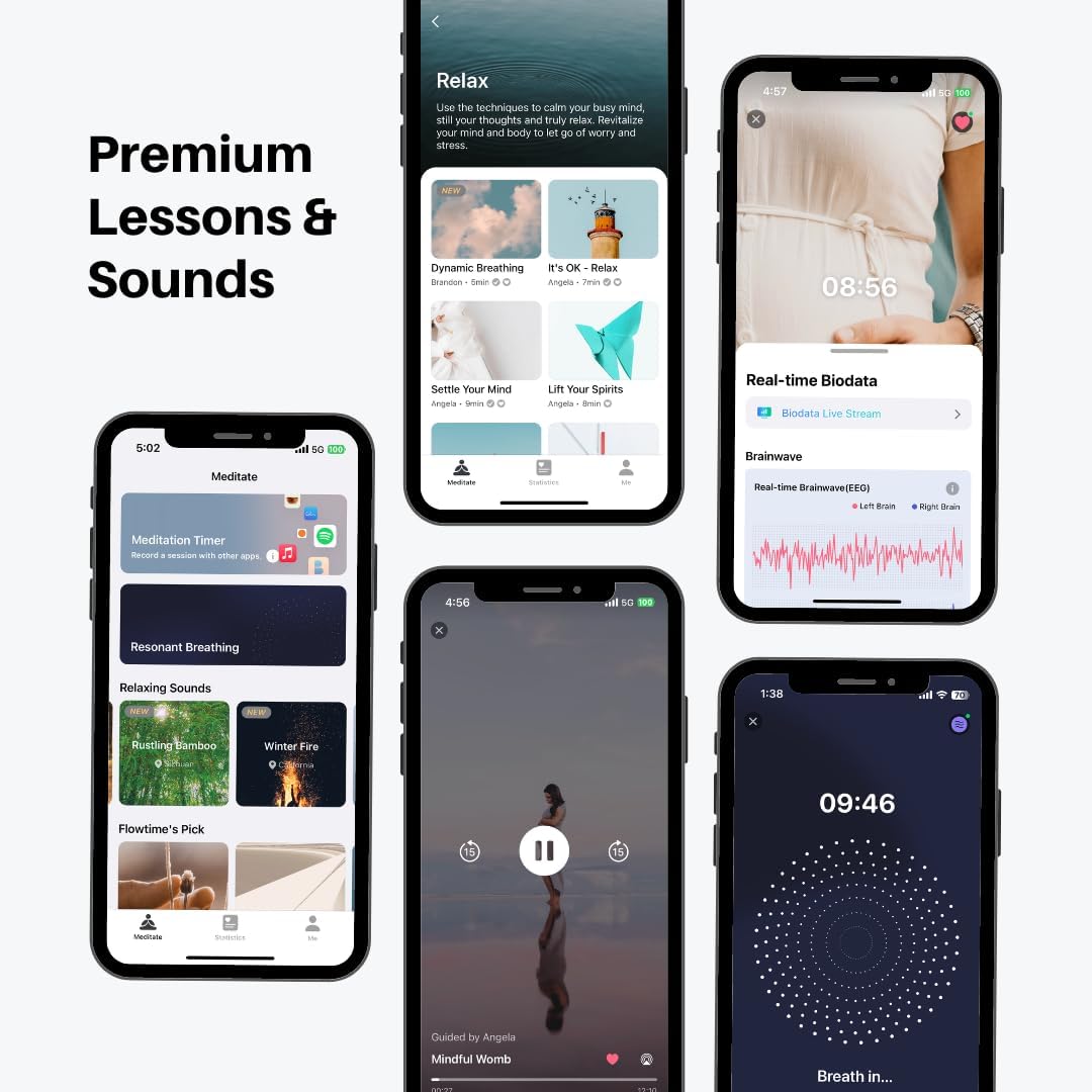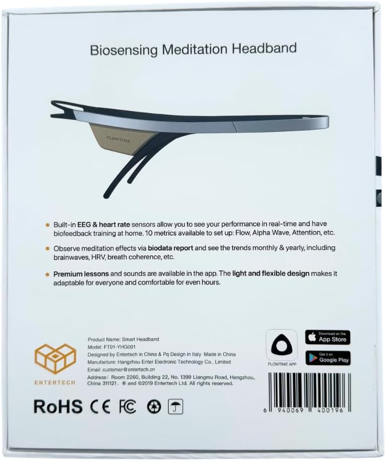 Flowtime: Biosensing Meditation Headband - Brain Tracker for Neurofeedback Training at Home - Heart Rate, Breath, HRV, Stress, Flow, Alpha, Theta, Beta, Gamma Wave Breakdowns