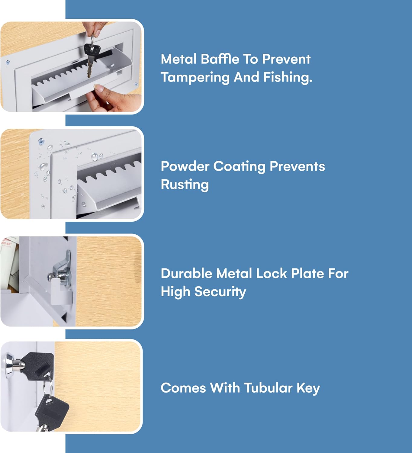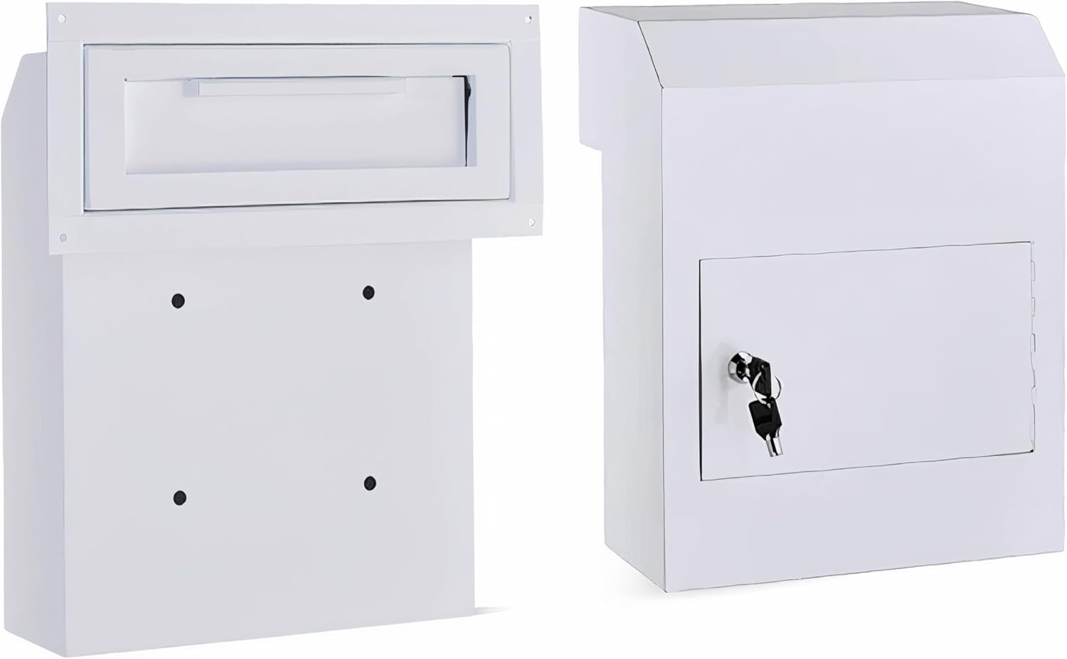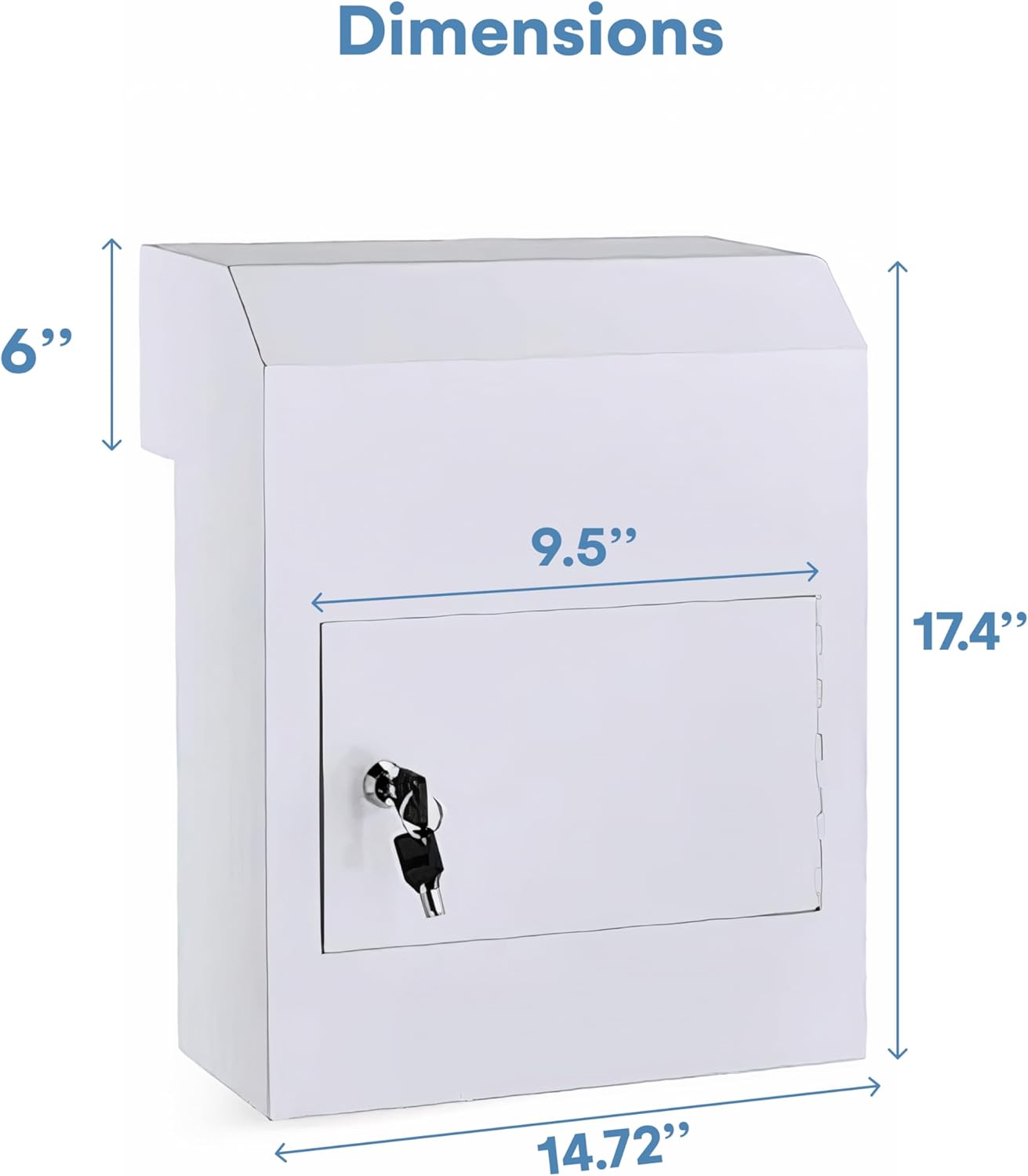 WE OFFER MORE THAN ANYONE ELSE, FOR LESS! Through the door drop box that fits door up to 1 ¾ inch thick, rust proof powder coated steel, anti theft lock and tubular key, lock protection metal plate, mail safe metal baffle, 500 cubic inches storage space, mounting hardware and instruction manual. Phew!SAFEST DROPBOX IN THE MARKET. WE CHALLENGE! Comes with anti-theft lock and tubular key that cannot be duplicated, lock protection metal plate to prevent breakage of rear access door, metal baffle to prevent fishing from outside!GET YOURSELF UNDISTURBED FROM FREQUENT DOOR OPENING! Our door mail slot receives envelopes up to 9.5 inches width. Can be used to receive mails, envelopes and letters at home (or) check, deposit, rent and money payment from the tenants (or) key drop box automotive at car rental garage and as drop boxes with lock for business. Not suitable for receiving large mail items such as books, magazines, catalogs, booklets, manila envelopes, and other larger mail.LARGE STORAGE CAPACITY, DOES NOT RUST! Our drop box comes with a 500 cubic inches large storage space at the back, secure your received mails and collect it anytime! Powder coated steel box and cover, prevent mail box from rusting due to outdoor conditions!EASY TO SETUP! Comes with step-by-step instruction manual and all necessary mounting hardware to easily install the drop box.