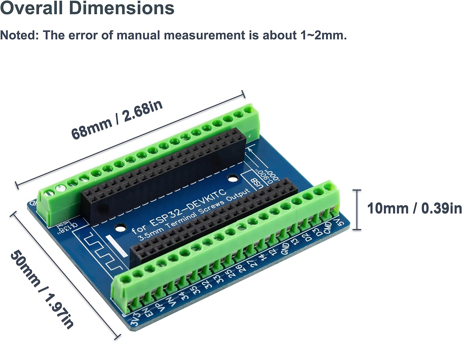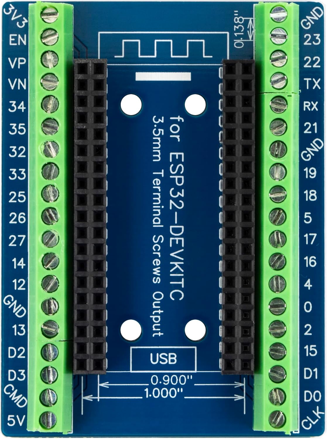 for ESP32 GPIO expansion board 38pin with terminal.The dual-row input bus allows you to plug in 0.9 "or 1.0" ESP32 modules for maximum compatibility.Shrapnel Screw Terminal: 3.5mm / 0.14" PitchIt's suitable for 18~24AWG cable connection, easy to use.It's fully assembled, no soldering required.