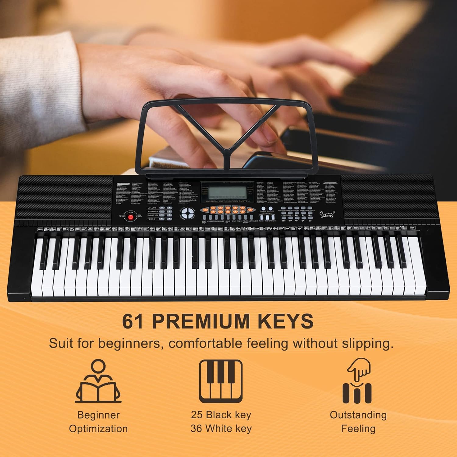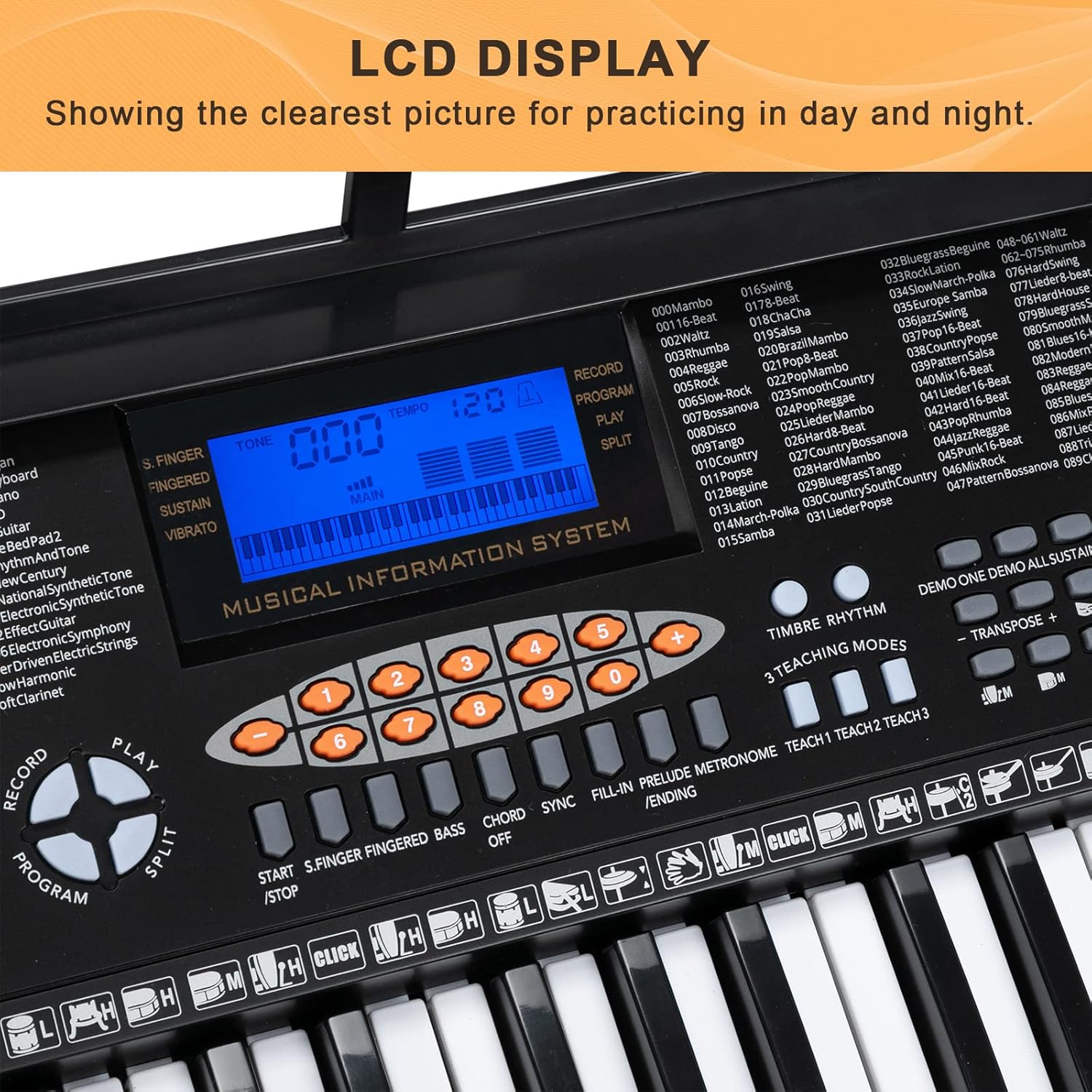 MULTI FUNCTIONAL ELECTRIC KEYBOARD PIANO: Designed with 61 keys, 350 timbres, 350 rhythms, 30 demo songs, 61 types of keyboard percussion. Features sound volume adjustment, multi-tone selection, metronome function, teaching functionsound recording, playback function, split/touch control function and so on. The rich features make you immersed in the world of music.