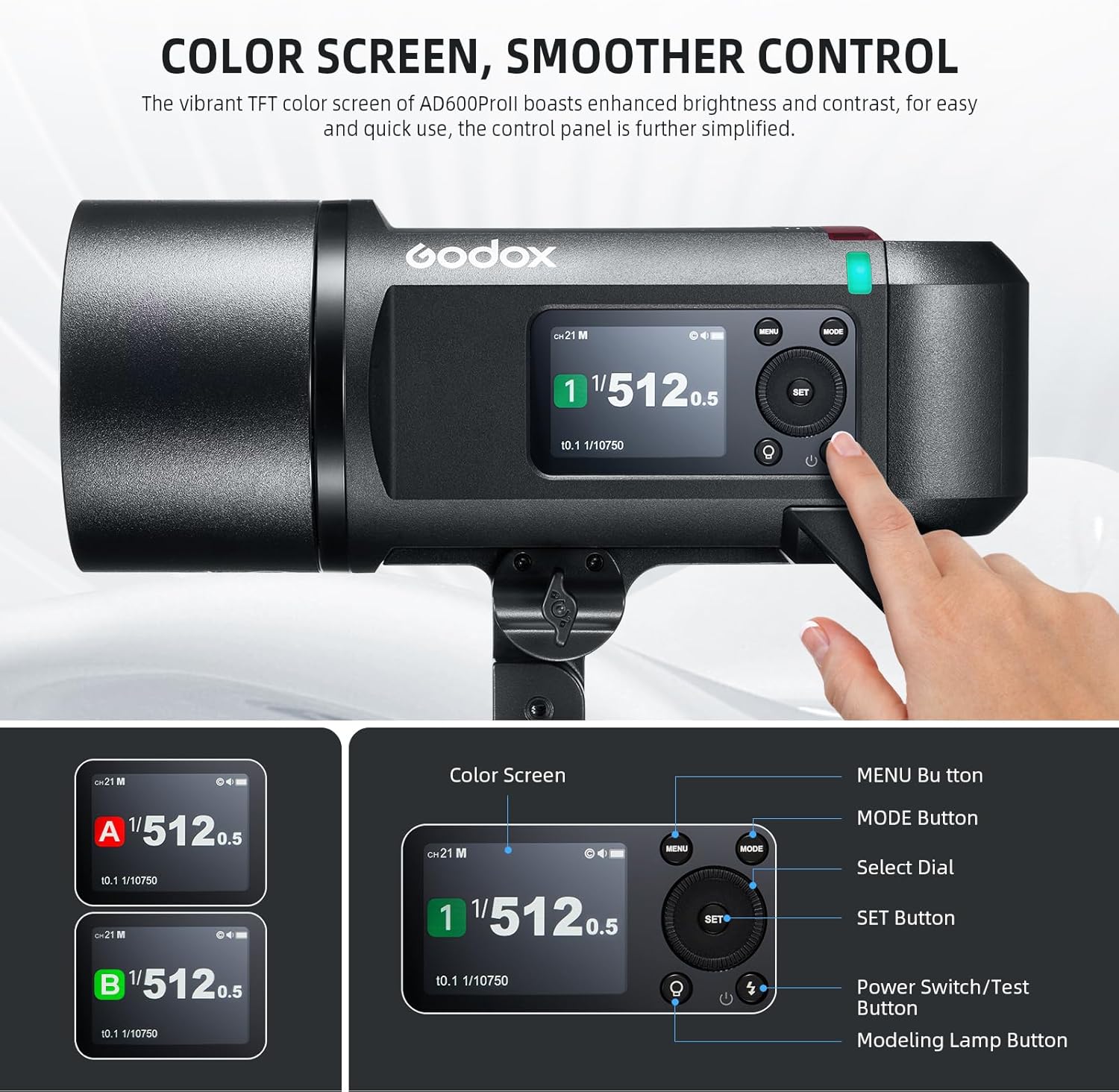 [Enhanced Screen and Easy Control]: The upgraded TFT color screen of the AD600ProII has better brightness and contrast, ensuring clear parameter viewing in any lighting. Its control panel is more user - friendly. The on/off button is directly on the panel, and the modeling light can be turned on or off with a 1 - second press, optimizing the operation process.
