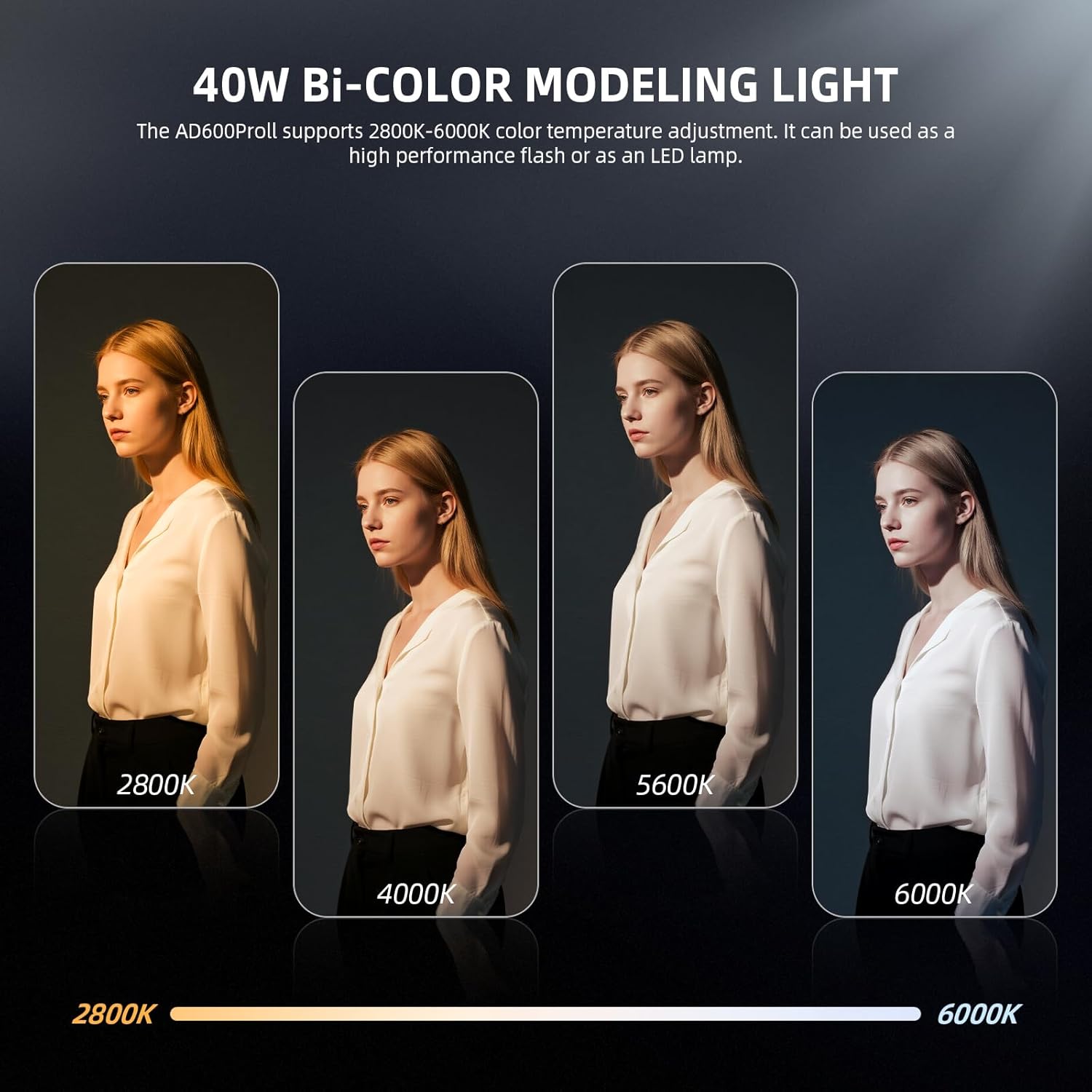 [Dual - Purpose 40W Bi - Color LED]: The 40W bi - color continuous LED modeling light (2800K - 6000K) on the AD600ProII serves dual purposes. It can be used as a high - performance flash for photography and a reliable light source for video shooting. In low - light situations, it can be a supplementary light to fill shadows or add warmth.