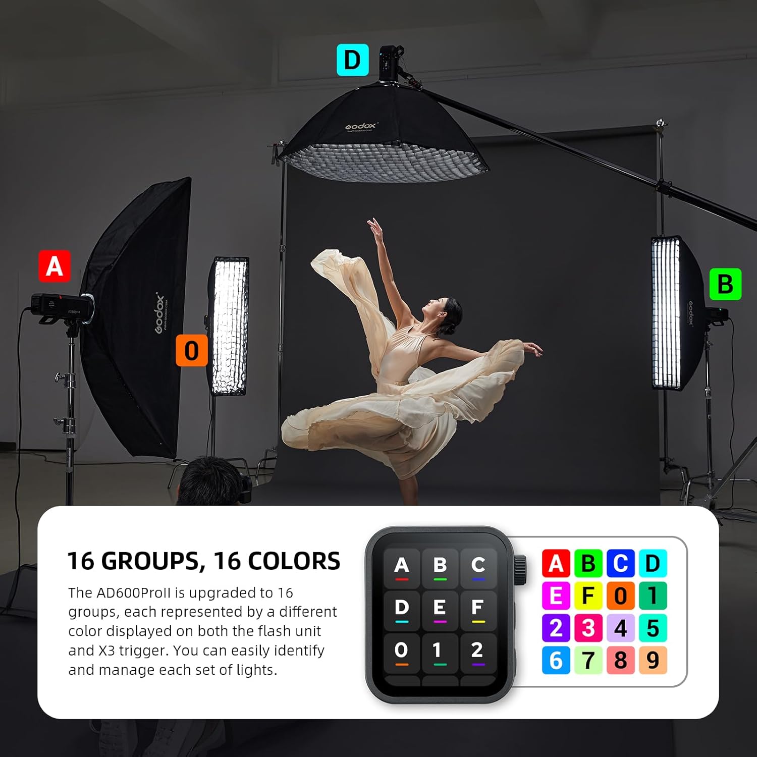 [One-Tap Sync and 16-Group Management]: The AD600ProII features a convenient One-Tap Sync function, which can quickly connect to the X3 Flash Trigger wirelessly within 1 second via the 2.4G system. It's also compatible with XproII, X2T and other Godox triggers. With 32 channels and a 100m transmission range, it offers great flexibility. Moreover, the 16 - group design with different colors shown on both the flash and X3 trigger simplifies multi-light setup management in various shooting scenarios.