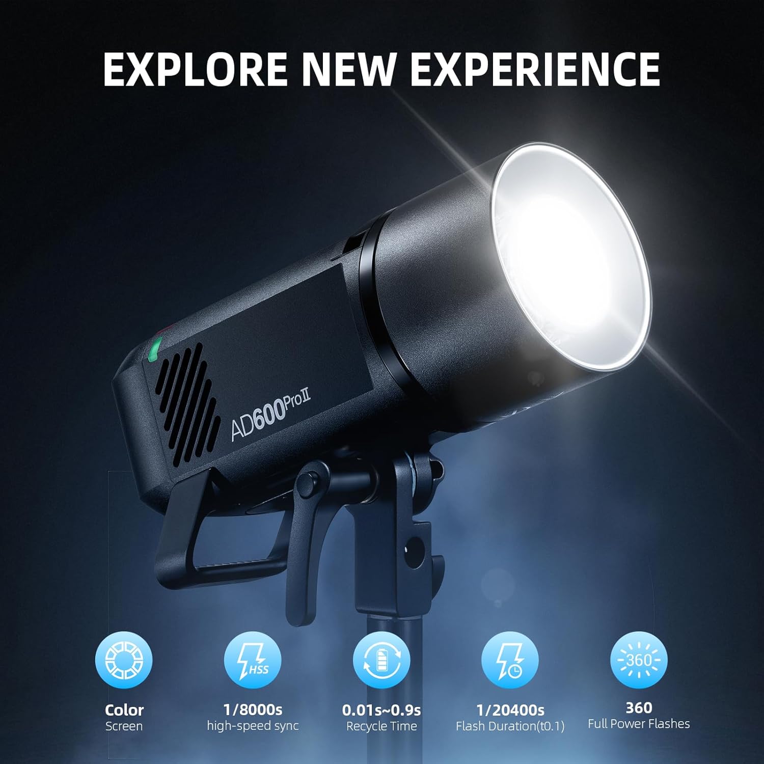 [Powerful Lighting Performance]: With a 600Ws output and a 10 - step power adjustment from 1/512 to 1/1, the AD600ProII allows for precise light control. In Freeze Mode, it has an ultra - short flash duration of 1/20400(t0.1) and a recycle time as fast as 0.01s (ranging from 0.01 - 0.9s). It supports High - Speed Sync up to 1/8000s, along with first - curtain and second - curtain sync. It also has a stroboscopic flash (up to 100 times, 100Hz) and 0.01 - 30s delay flash functions.