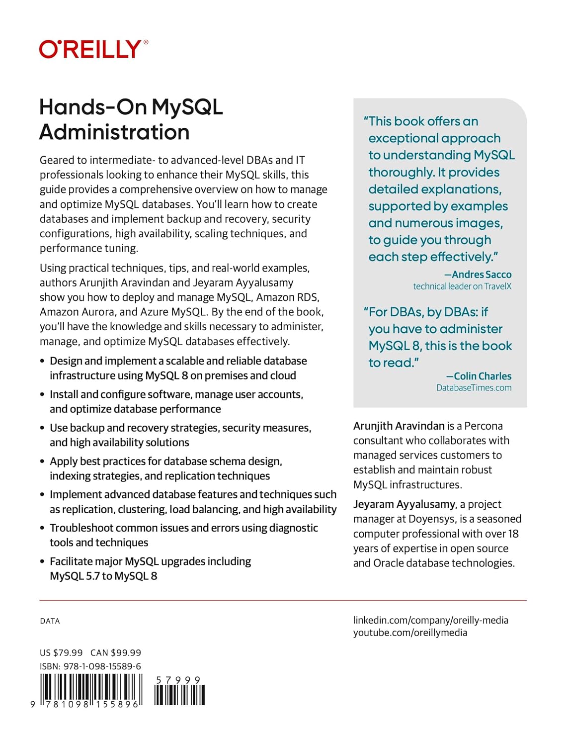 Using practical techniques, tips, and real-world examples, authors Arunjith Aravindan and Jeyaram Ayyalusamy show you how to deploy and manage MySQL, Amazon RDS, Amazon Aurora, and Azure MySQL. By the end of the book, you'll have the knowledge and skills necessary to administer, manage, and optimize MySQL databases effectively.