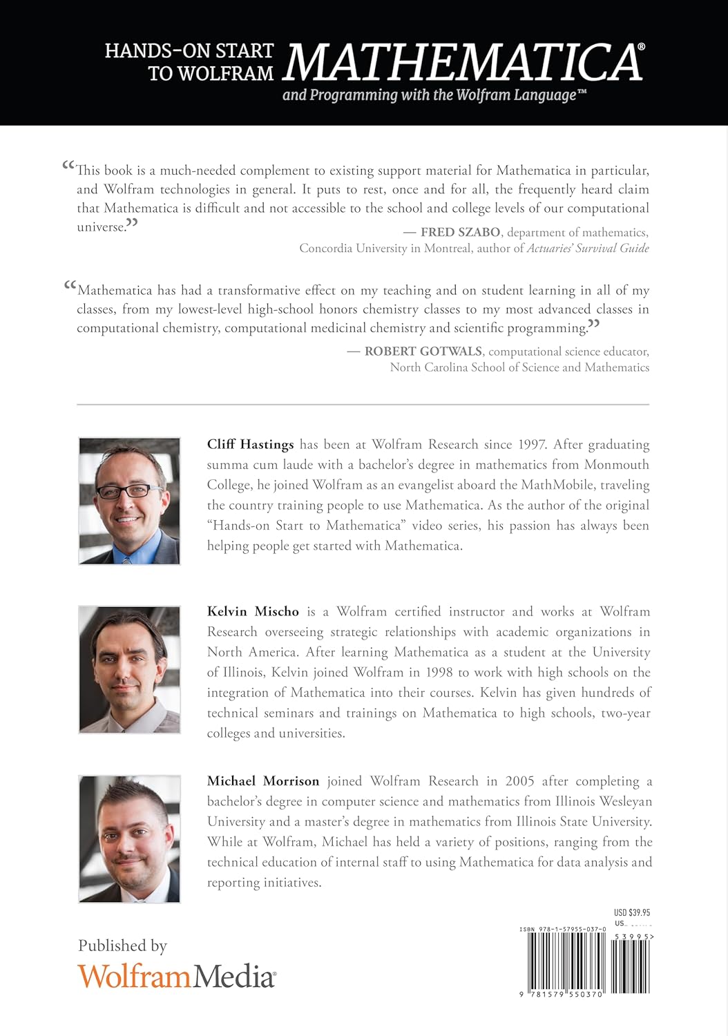 "This book is the much-needed complement to existing support material for Mathematica in particular, and Wolfram technologies in general. It puts to rest, once and for all, the frequently heard claim that Mathematica is difficult and not accessible to the school and college levels of our computational universe."
