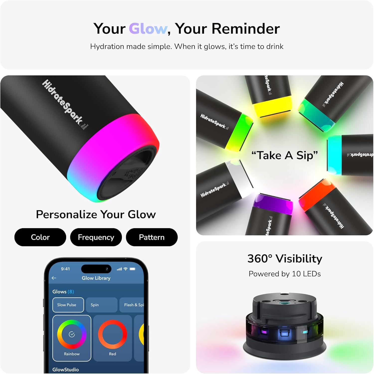 Glows remind you to hydrate throughout the day. Customize your glows in the HidrateSpark App.