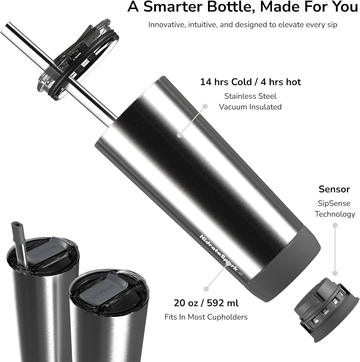 Hidrate Spark PRO Smart Tumbler Bundle – Insulated Stainless Steel – Tracks Water Intake with Bluetooth, LED Glow Reminder When You Need to Drink – 20oz, Brushed Stainless Steel + 3 Straws