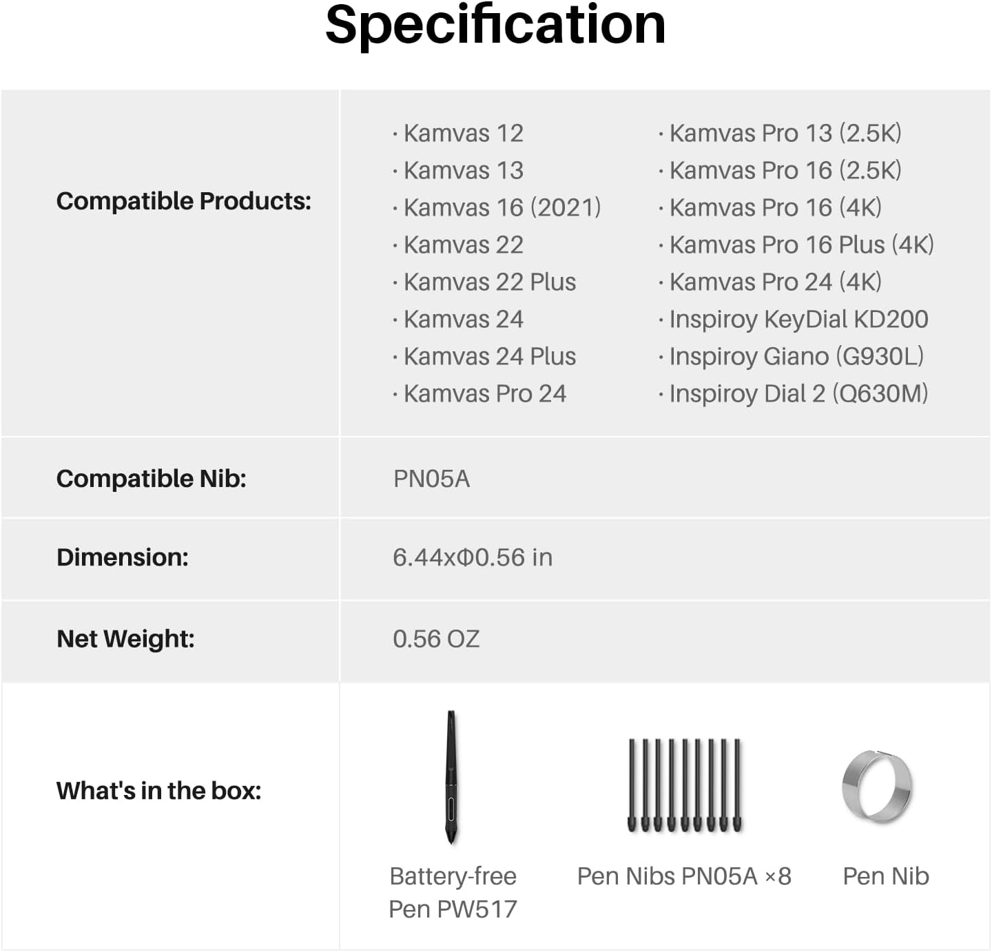 PW517 Battery-Free Stylus Only COMPATIBLE to Huion Kamvas 12; Kamvas 13; Kamvas pro 13(2.5K); Kamvas 22; Kamvas 22 Plus; Kamvas Pro 24; Kamvas Pro 24 (4K); Kamvas 16(2021); HS610; Kamvas Pro 16 (2.5K); Kamvas Pro 16 (4k); Kamvas Pro 16 Plus (4k); KD200; G930L