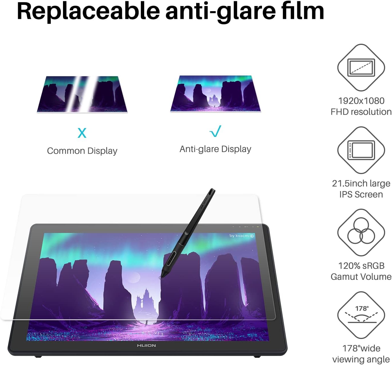 Anti-glare: The anti-glare matte film applied on Kamvas 22 art tablet alleviates the glare of reflection and guarantees clear display effects. The matte finish can also mimic the feel of drawing on paper.