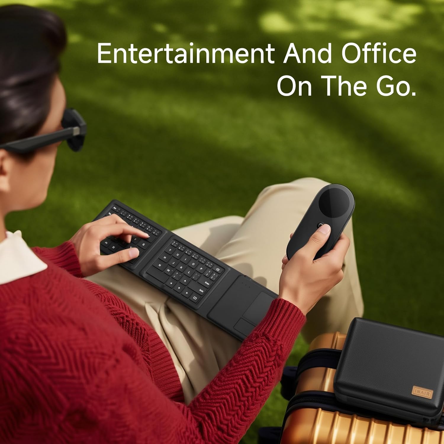 【INAIR 2 Pro Go Pack Set】: This set conveniently houses AR glasses, Pod, a foldable keyboard, and other accessories in a portable case. The foldable spatial touch keyboard supports single-finger, two-finger, and three-finger gestures, enabling actions such as pushing/pulling windows, readjusting the field of view, and adjusting immersion levels. Dedicated shortcut keys cover volume, brightness, and AR-specific controls, delivering an intuitive operating experience while maintaining portability.