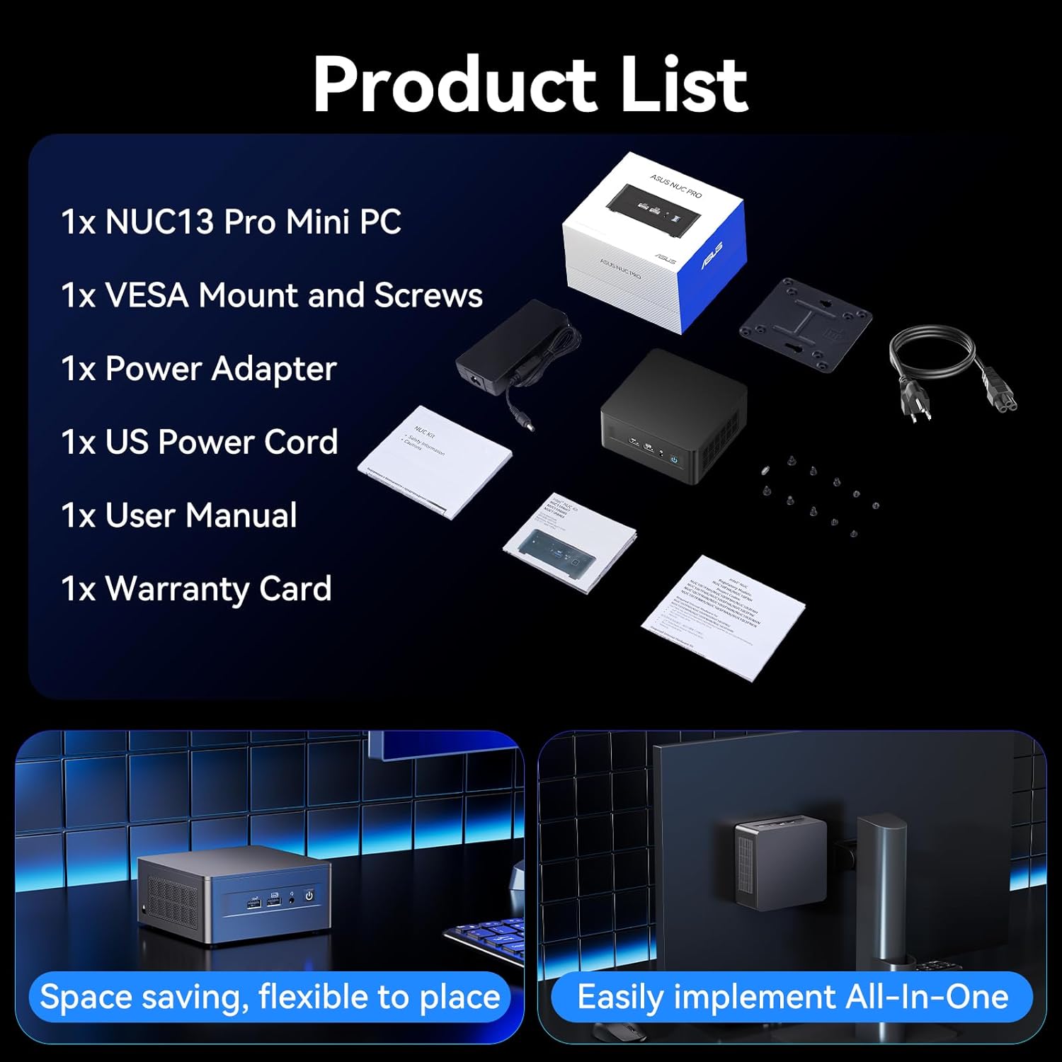 【Less Size, More Business Performance】--Intel NUC 13 Pro mini computers measures only 4.6 in * 4.4 in * 2.1 in, you can be easily placed in crowded workstations or small spaces. Because of the small size to put under you big screen TV for internet movies instead of just limited by the smart TV paid options. You can also mount a MINI PC behind a computer monitor using VESA, and turn your monitor into a pseudo "All-in-One" which is cool. Gives you a clean and uncluttered desktop environment.
