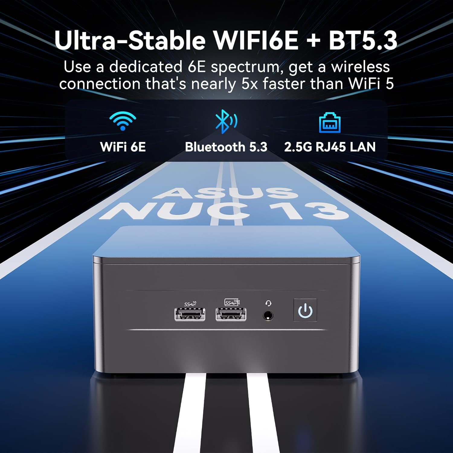 【Connectivity & Expandability】--Intel NUC 13 Pro small computer comes with Intel i226 Ethernet port for speeds up to 2.5Gbps, supports WiFi 6E with 2.4GHz, 5GHz, 6GHz three bandwidths & Bluetooth 5.3. It which could be connected with your mouse, acoustics or headset. It can work with server, monitoring equipment, office equipment, monitor, projector, TV and so on. Built-in fan cooling so you don't have to worry about multitasking overheating your product.