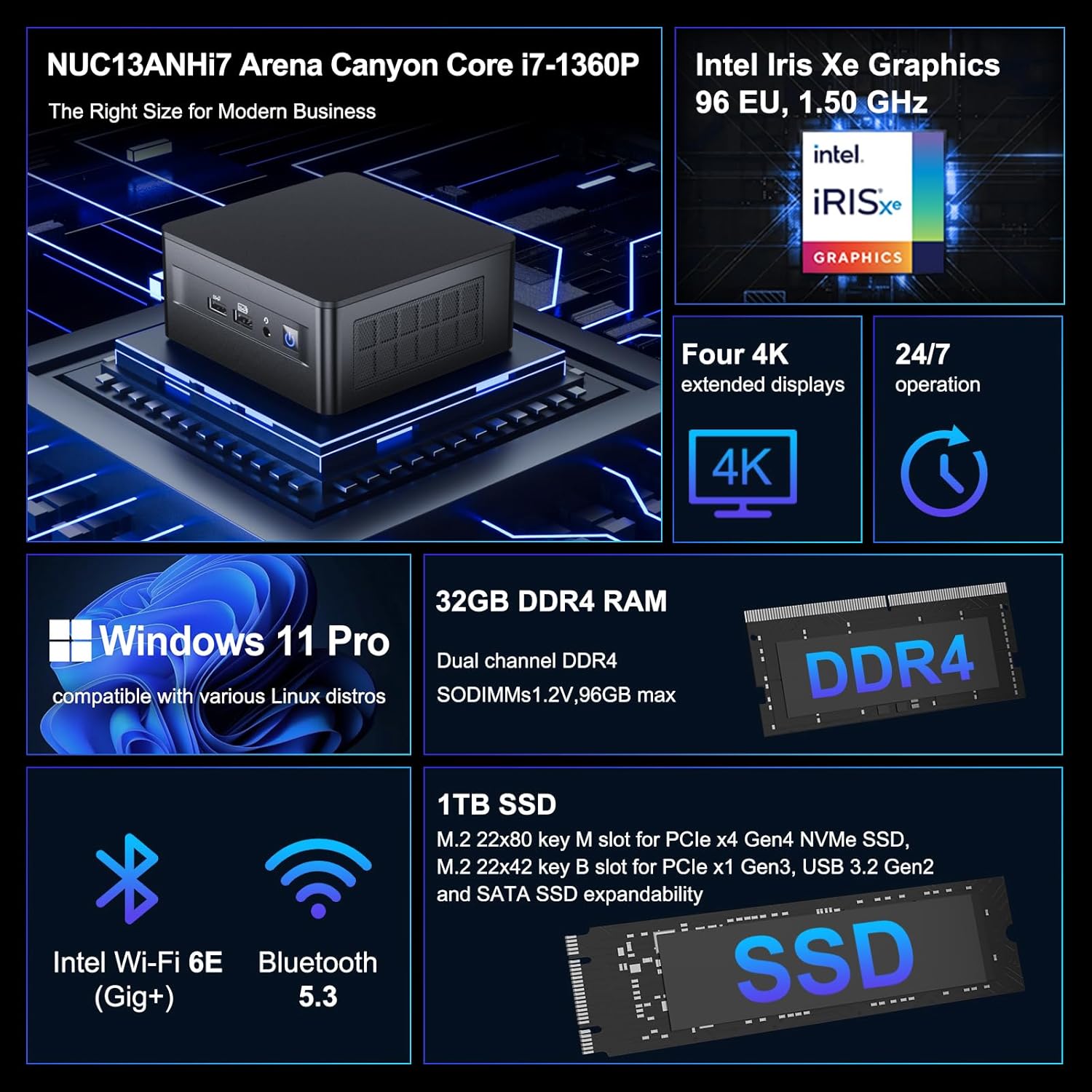 【13th Gen Intel Core i7-1360P CPU】Intel NUC 13 Pro Mini PCs, Kits, offer the perfect combination of size, performance, sustainability, and reliability to drive modern business. It all starts with 13th Gen Intel Core i7-1360P processor that deliver outsized performance in a 4x4 form factor. up to 12 cores (4P+8E), 16 threads,18MB Intel Smart Cache, P-Cores: Up to 5.00 GHz Turbo, E-Cores: Up to 3.70 GHz Turbo, Intel Iris Xe Graphics 96EU, 1.50 GHz, and up to 64GB dual-channel DDR4-3200 memory.