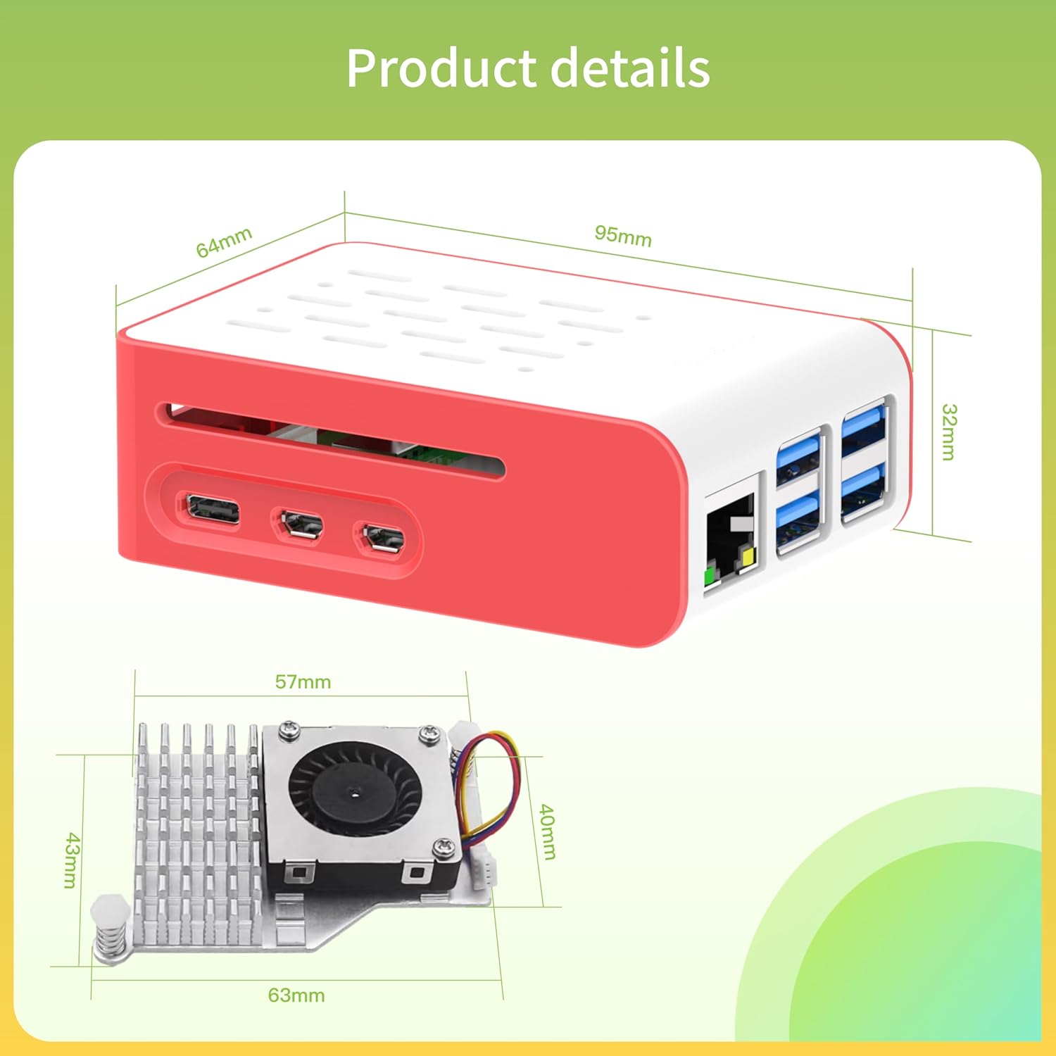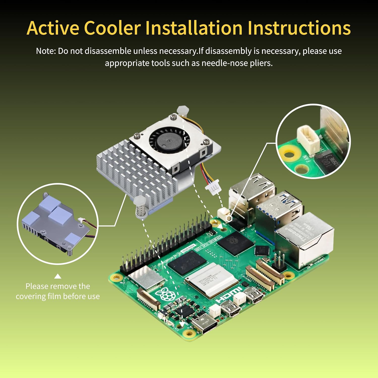 iRasptek Active Cooler: The active cooler is made of high-quality anodized aluminum with a high-performance PWM fan, which is able to effectively reduce the temperature of Pi5 and ensure that it maintains good performance during long periods of high load operation.