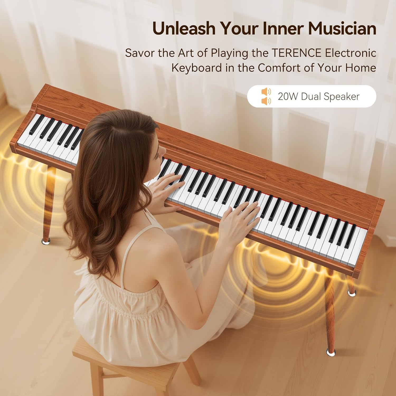 Digital 88-key keyboard piano for everyone:The TERENCE 88-key digital piano with weighted action features a weighted action mechanism that replicates the playing feel of a real piano, and a three-pedal design, suitable for beginners, advanced players, and professionals. This 88-key piano is the perfect choice for anyone who values quality! The TERENCE 88-key digital piano is equipped with powerful 20W stereo speakers (10W x 2) that deliver a full, clear piano tone. The high-quality DREAM sound chip ensures authentic sound quality.