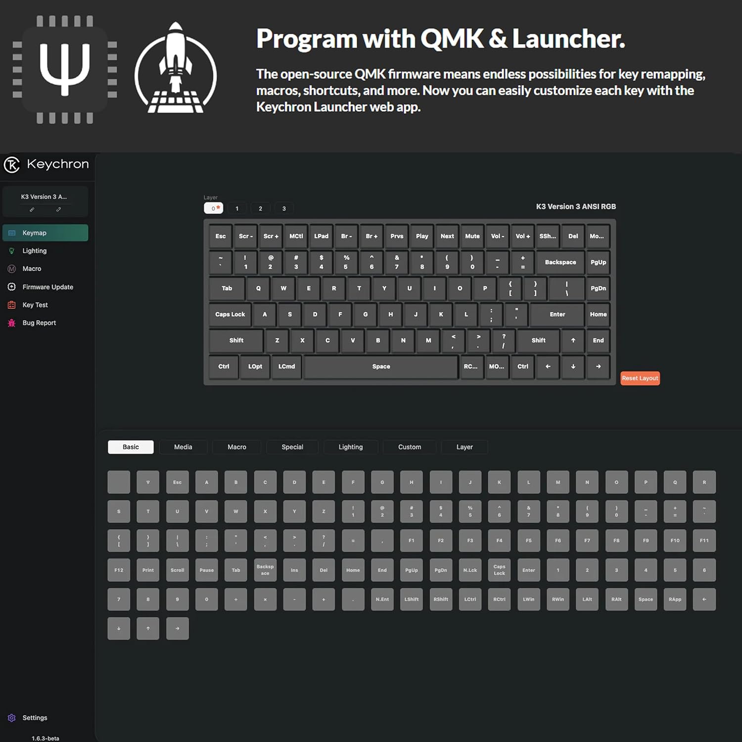 ✅ QMK & Launcher. - The open-source QMK firmware means endless possibilities for key remapping, macros, shortcuts, and more. Now you can easily customize each key with the Keychron Launcher web app.